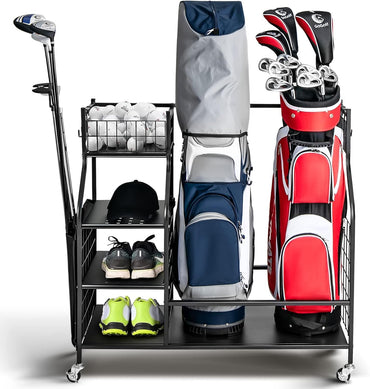 Double Golf Bag Storage Rack for Garage with Lockable Universal Wheels
