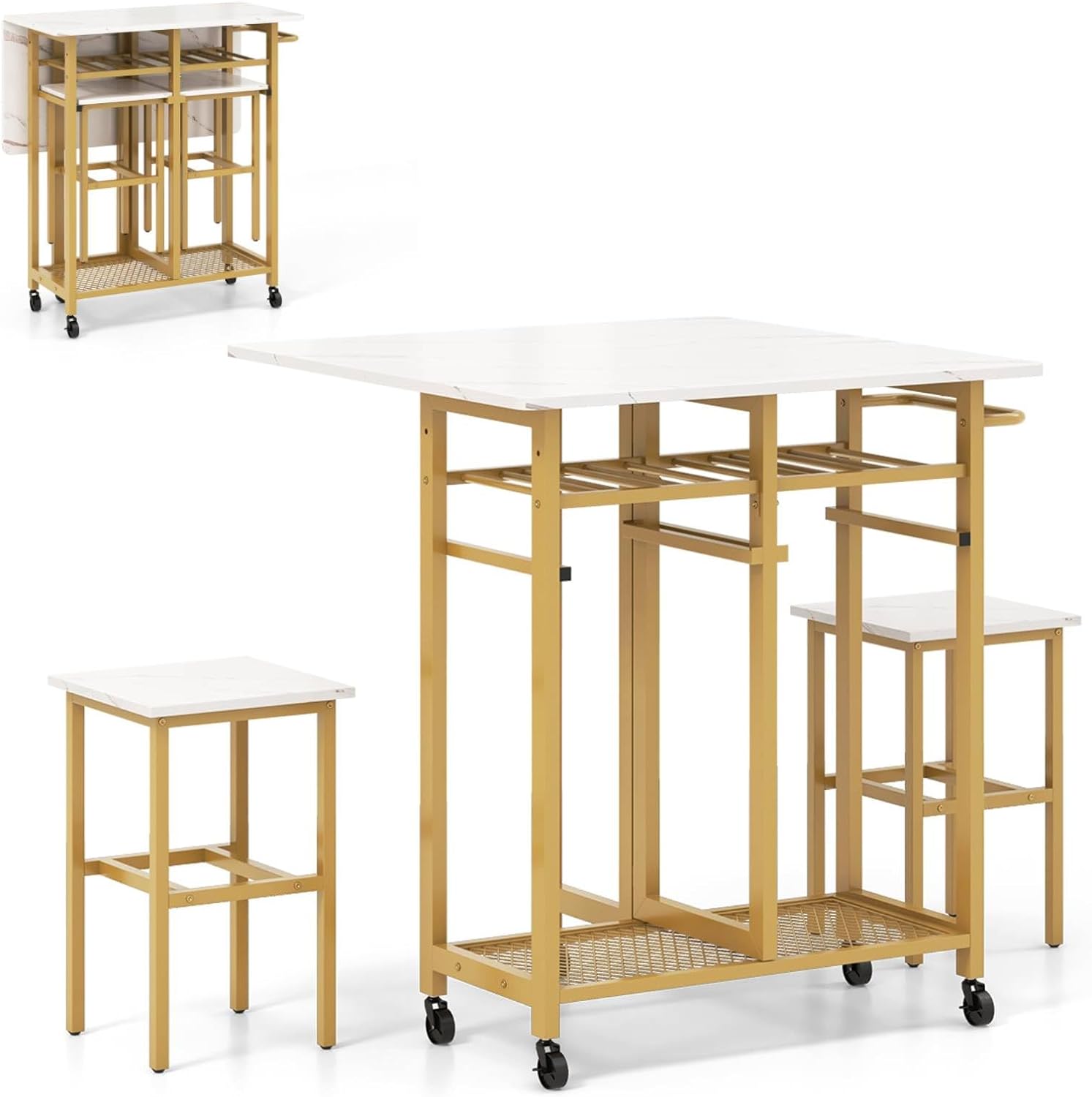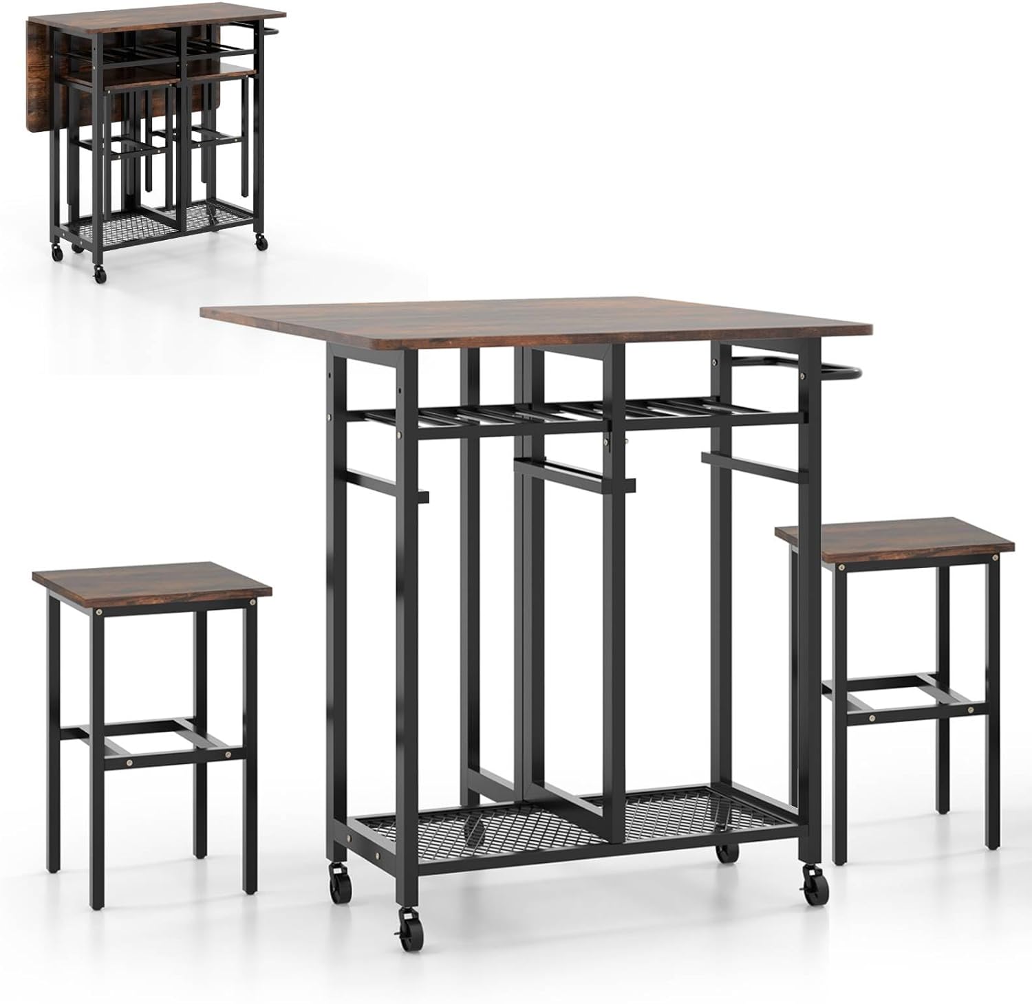 Giantexuk 3 pcs dining room set, folding dining table and stools set with wine rack, storage shelves & wheels