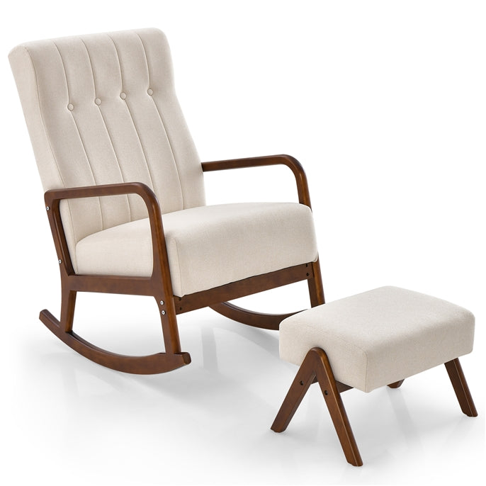 Upholstered fabric rocker with solid rubber wood frame and padded cushion