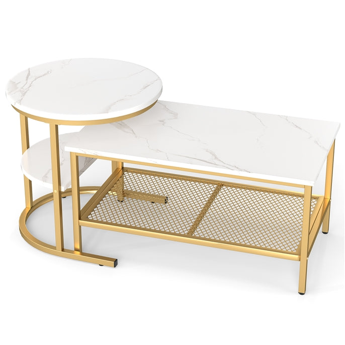 Nesting coffee table set of 2, faux marble cocktail center and round end table with storage shelf & adjustable foot pads