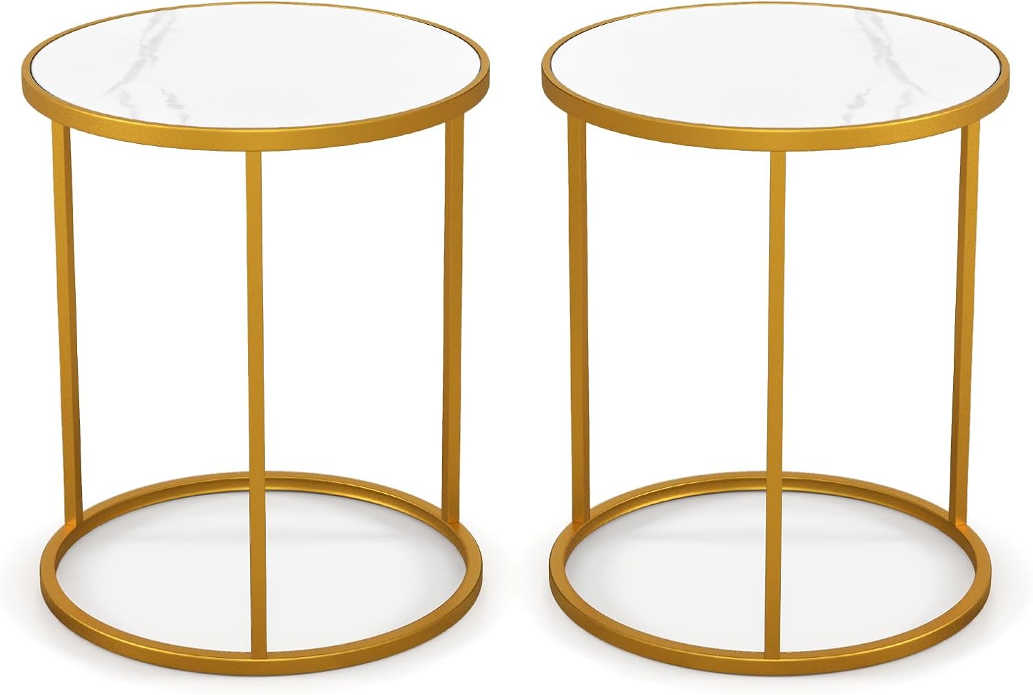 Product Details: Featuring a white marble top and a gold-colored metal frame, this round end table exudes elegance and sophistication. Its compact size saves valuable space...