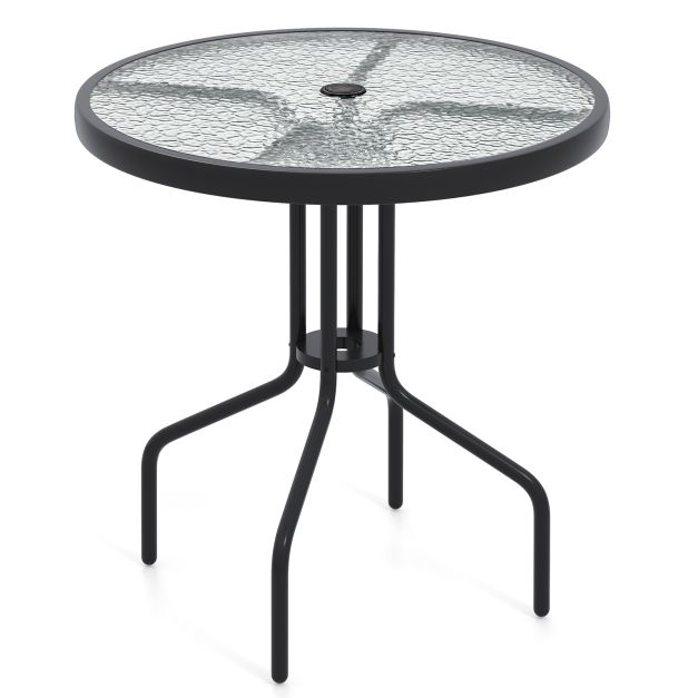 The rippled tempered glass surface makes the dining table an elegant and long-lasting addition for relaxing. A built-in umbrella hole, with additional securing features, offers shaded...