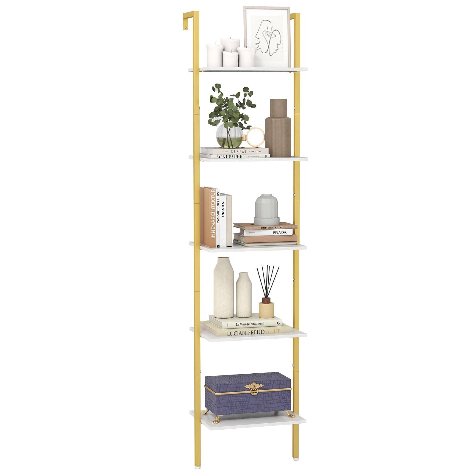 Product Detail: Organize your space efficiently with this 5-tier wall ladder bookshelf with drawer! Not only does this wall mounted bookcase offer 4 spacious shelves for...
