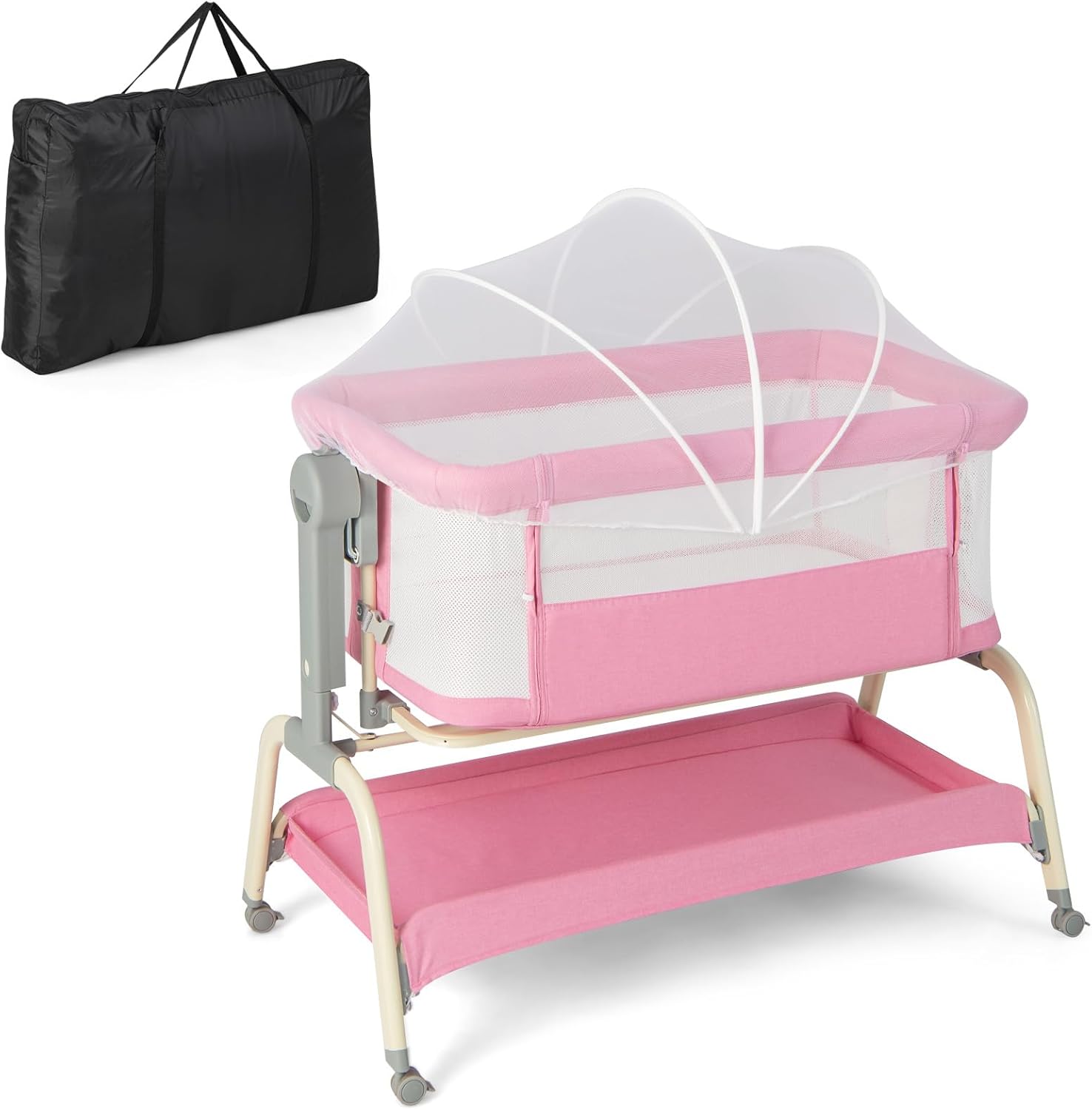 4-in-1 baby bedside crib, heights adjustable rocking bassinet with mattress, detachable net
