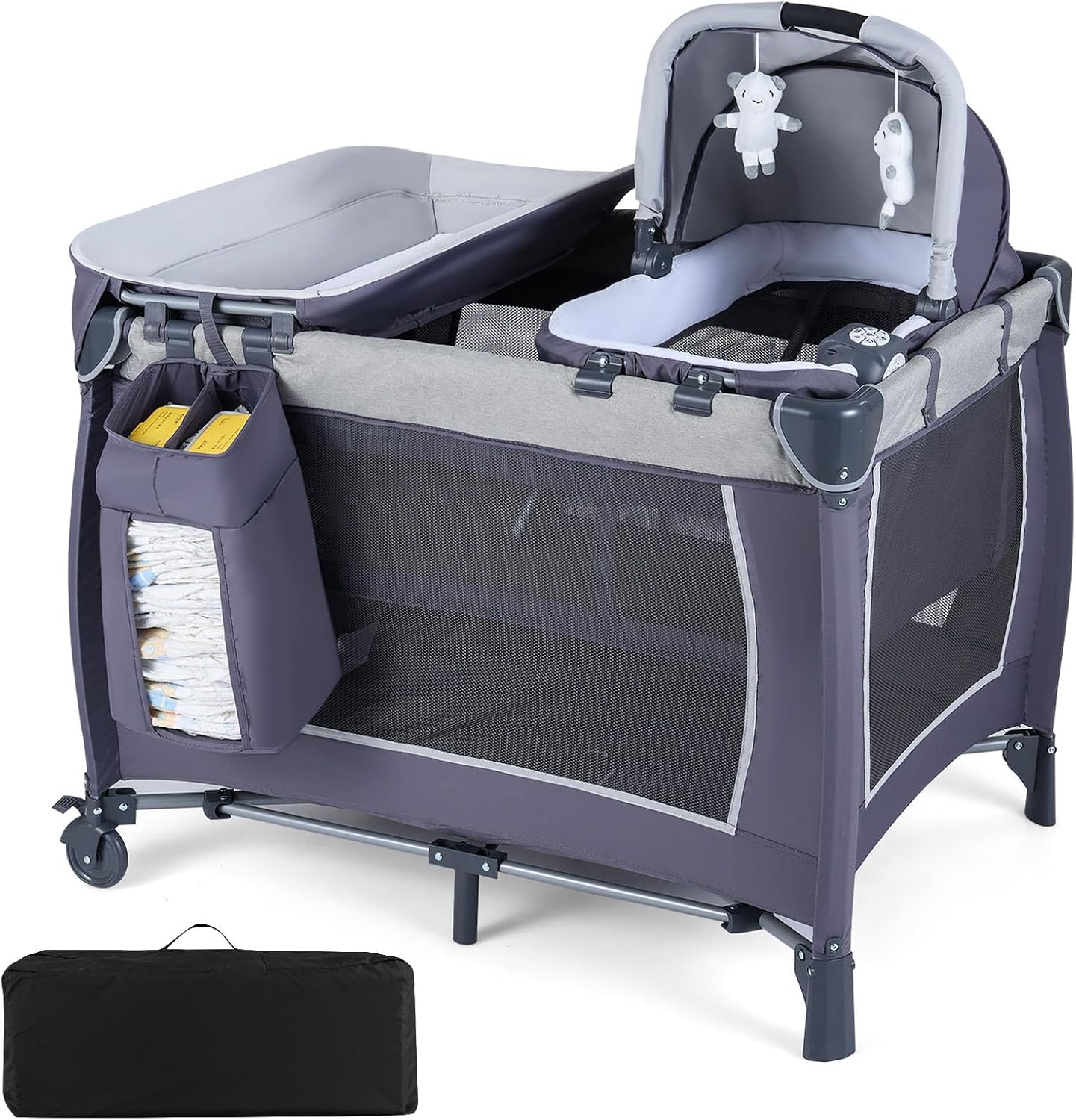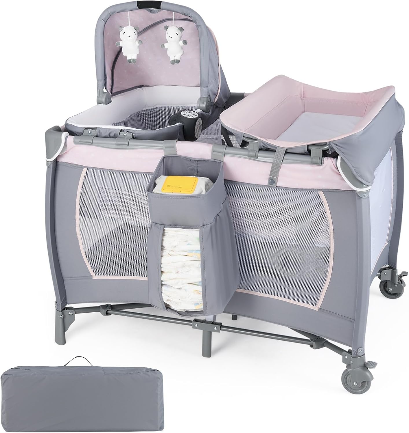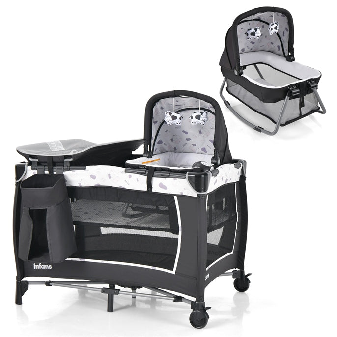 5 in 1 Travel Cot, Portable Baby Crib Bassinet with Rocking Bassinet & Diaper Changing Table