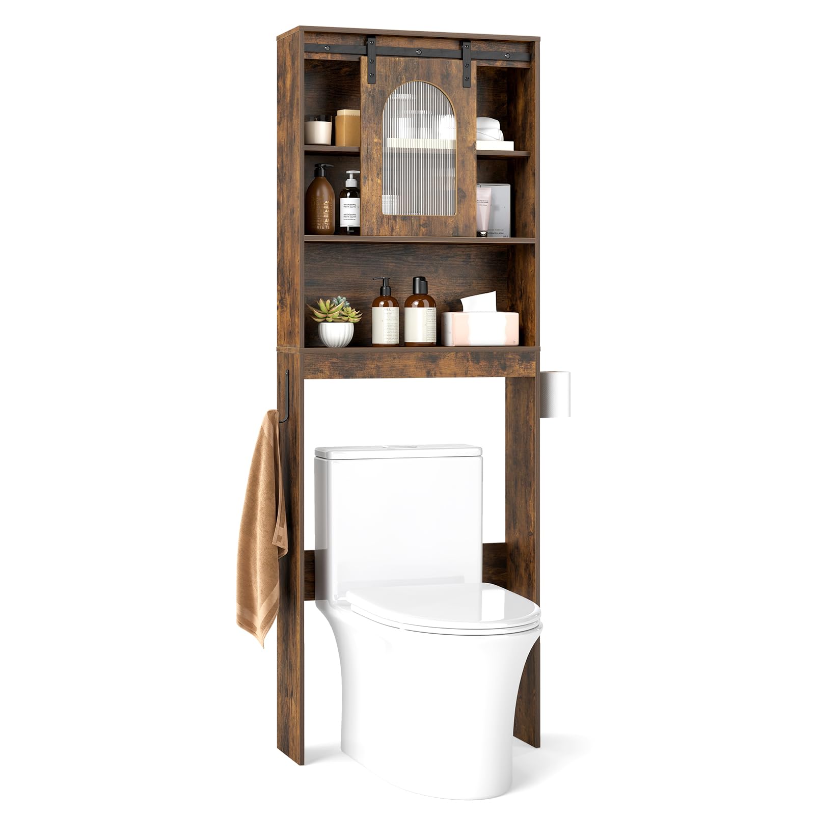 Over toilet storage unit, freestanding bathroom space saver with sliding barn door