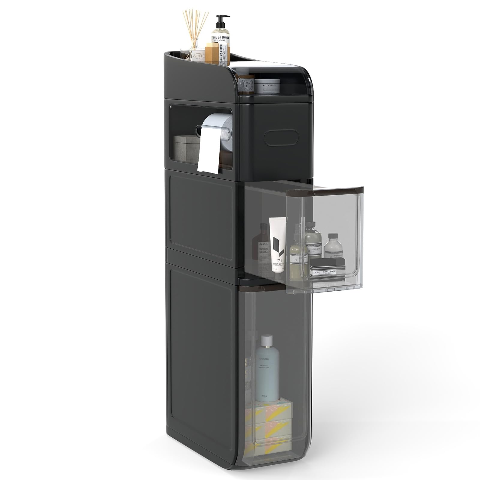 • 4-tier bathroom storage cabinet with 2 drawers and tissue box