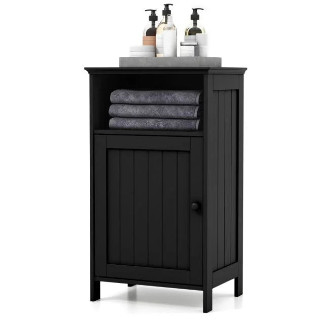 This bathroom floor cabinet has a spacious top, an open shelf and a single door enclosed cabinet to store your towels, tissues, candles, body washes and...