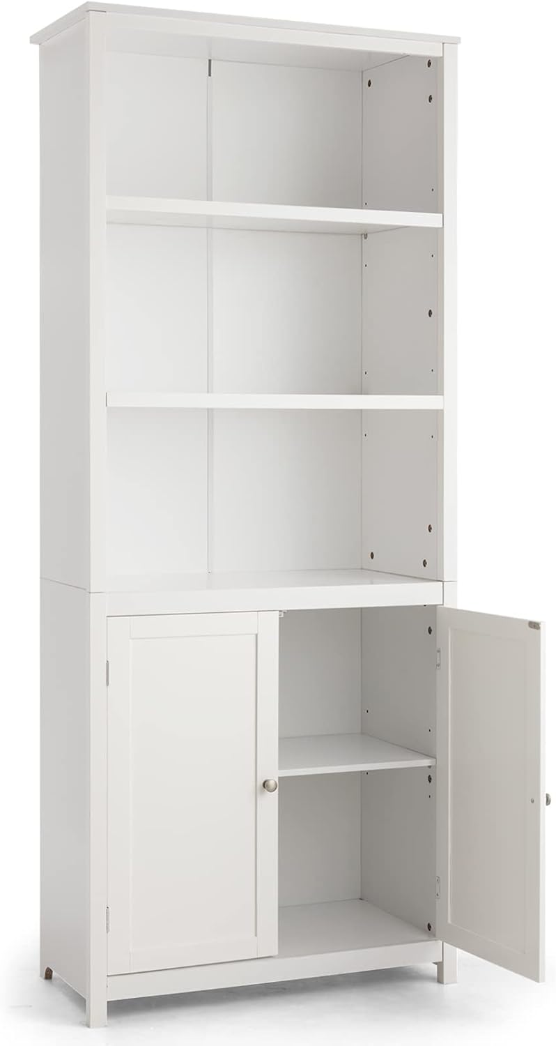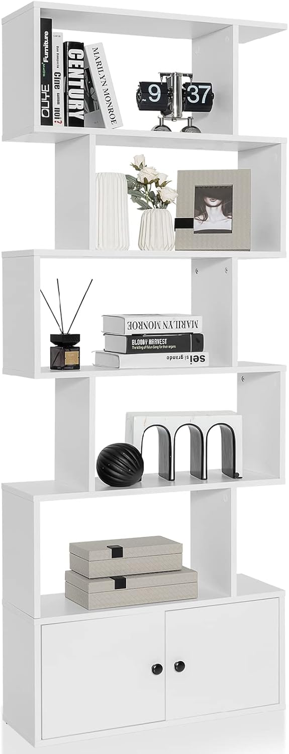 【5/6-Tier Storage Shelf with Cabinet】This S shape bookshelf features 6-tier design with 5 open shelves and 1 door cabinet, providing ample storage space for organizing your...