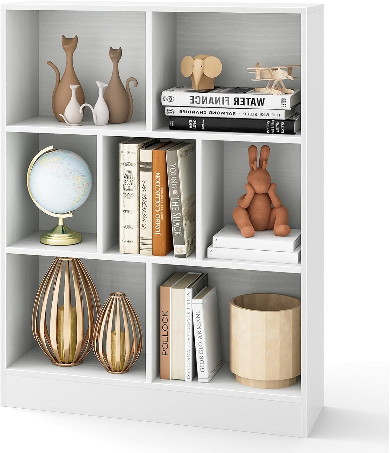 Wooden cube bookcase, 3 tier open storage shelving unit with 7 compartments, 80 x 24 x 104cm