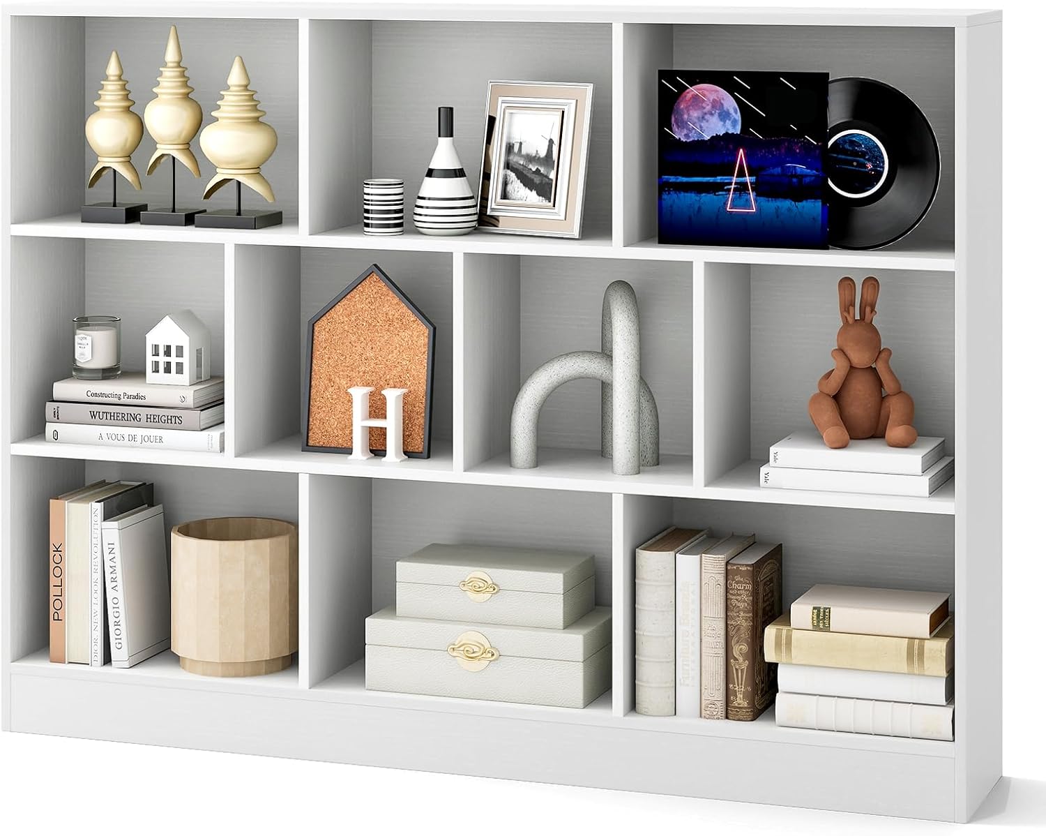 Wooden cube bookcase, 3 tier open storage shelving unit with 10 compartments, 140 x 24 x 104cm
