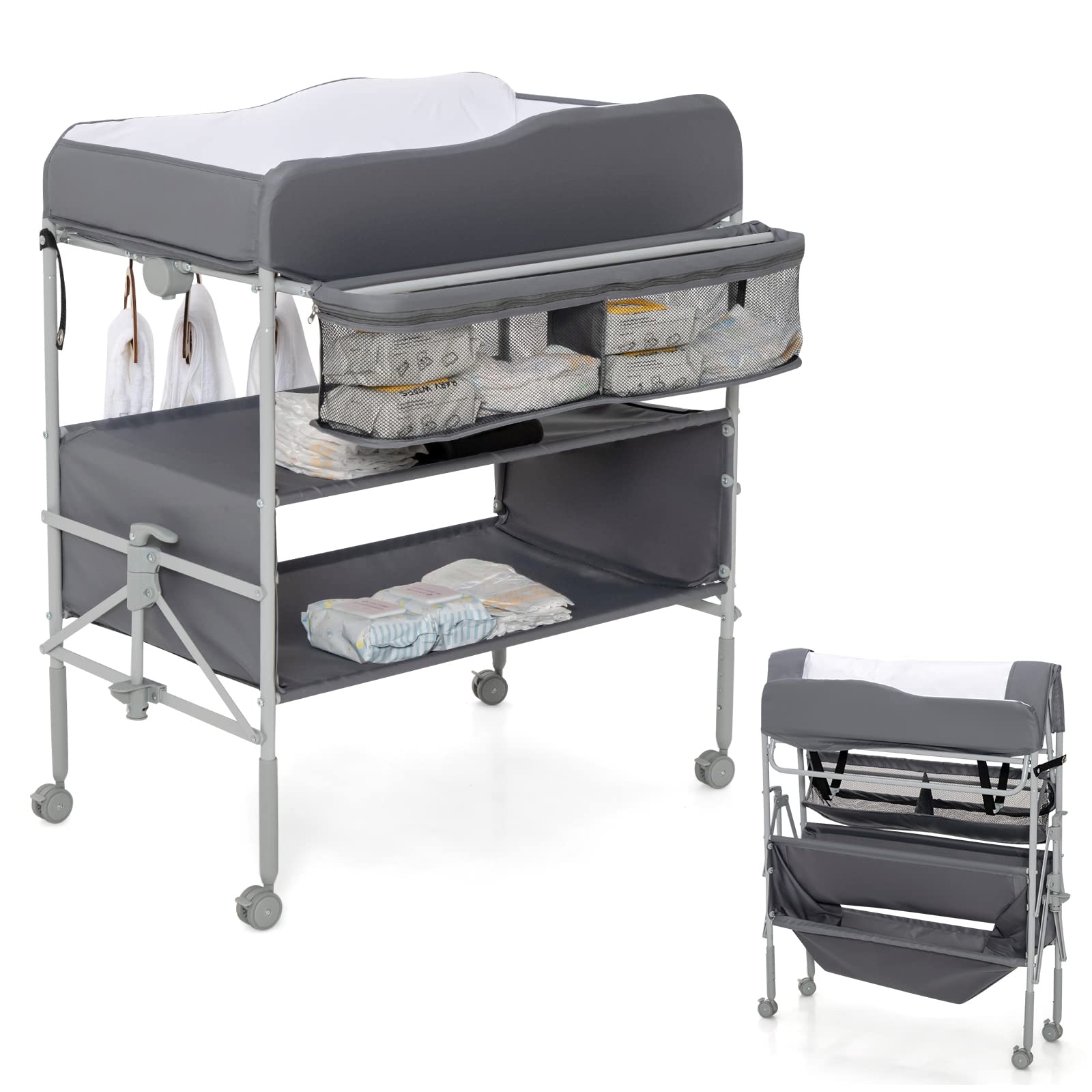 Baby changing table folding nursery changing station with 4 lockable wheels