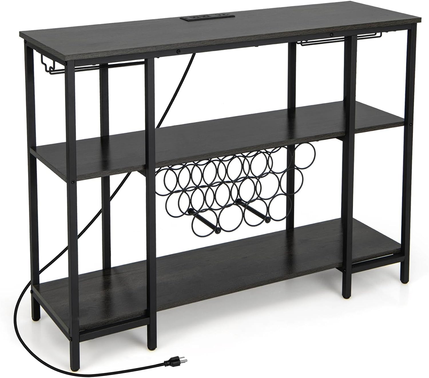 GiantexUK Wine Bar Cabinet, 3-Tier Kitchen Bar Table with 21 Bottles Wine Rack, Glass Holder, Charging Station & Adjustable Foot Pads