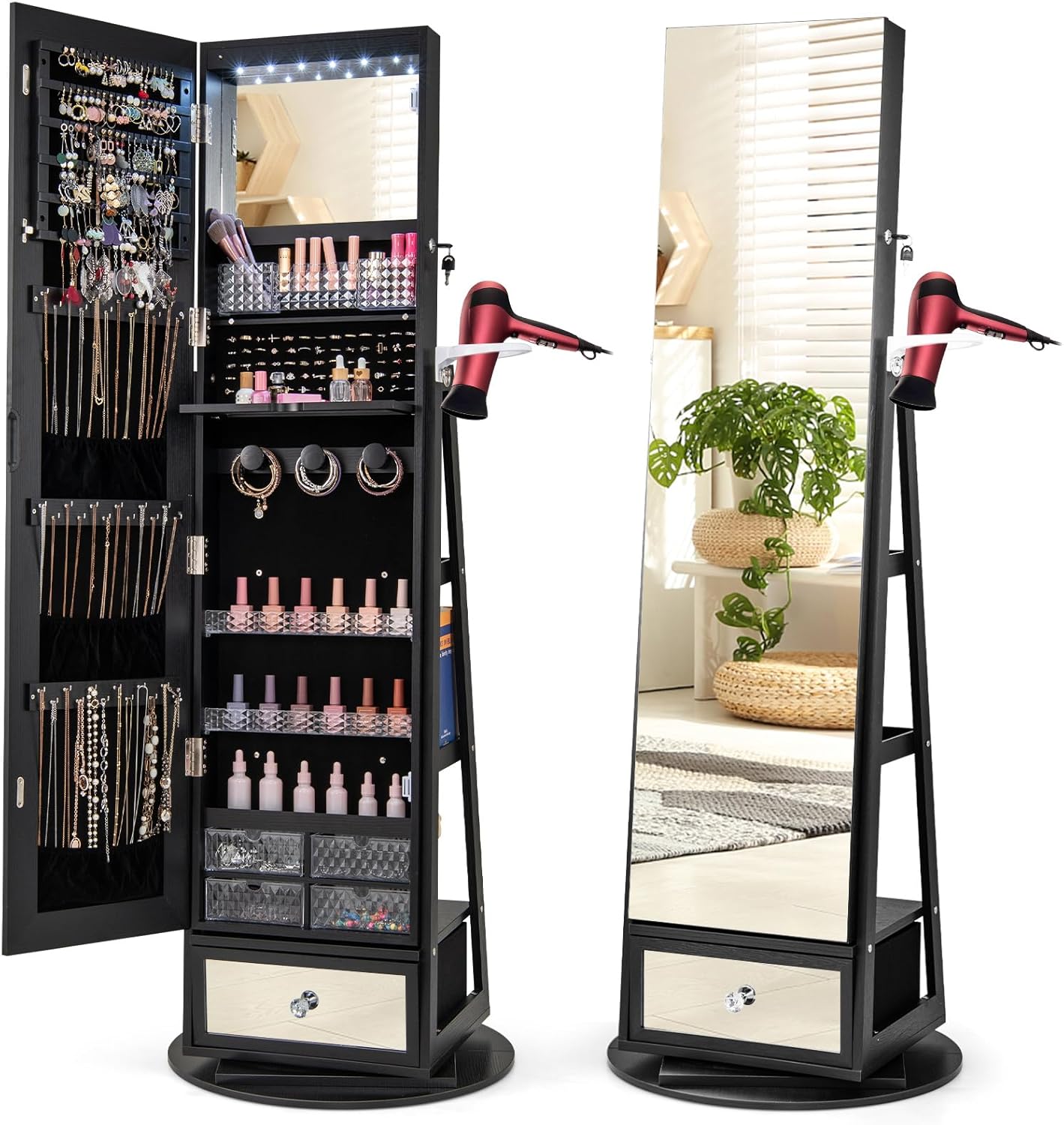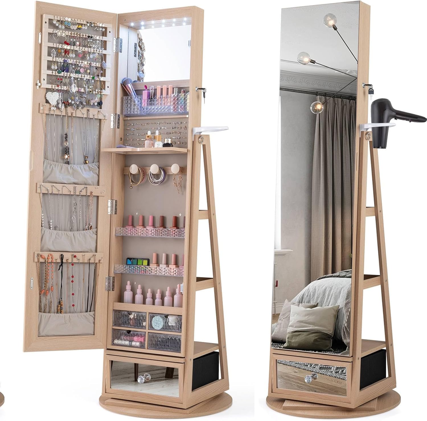 360° Swivel Lockable Jewelry Armoire Cabinet with Full-Length Mirror