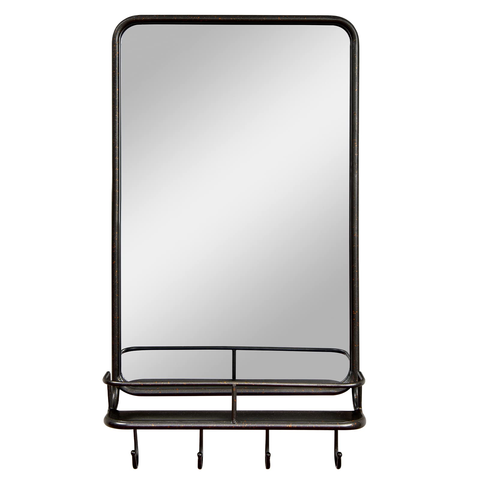 Wall-mounted rectangular bathroom mirror with storage shelf and hooks