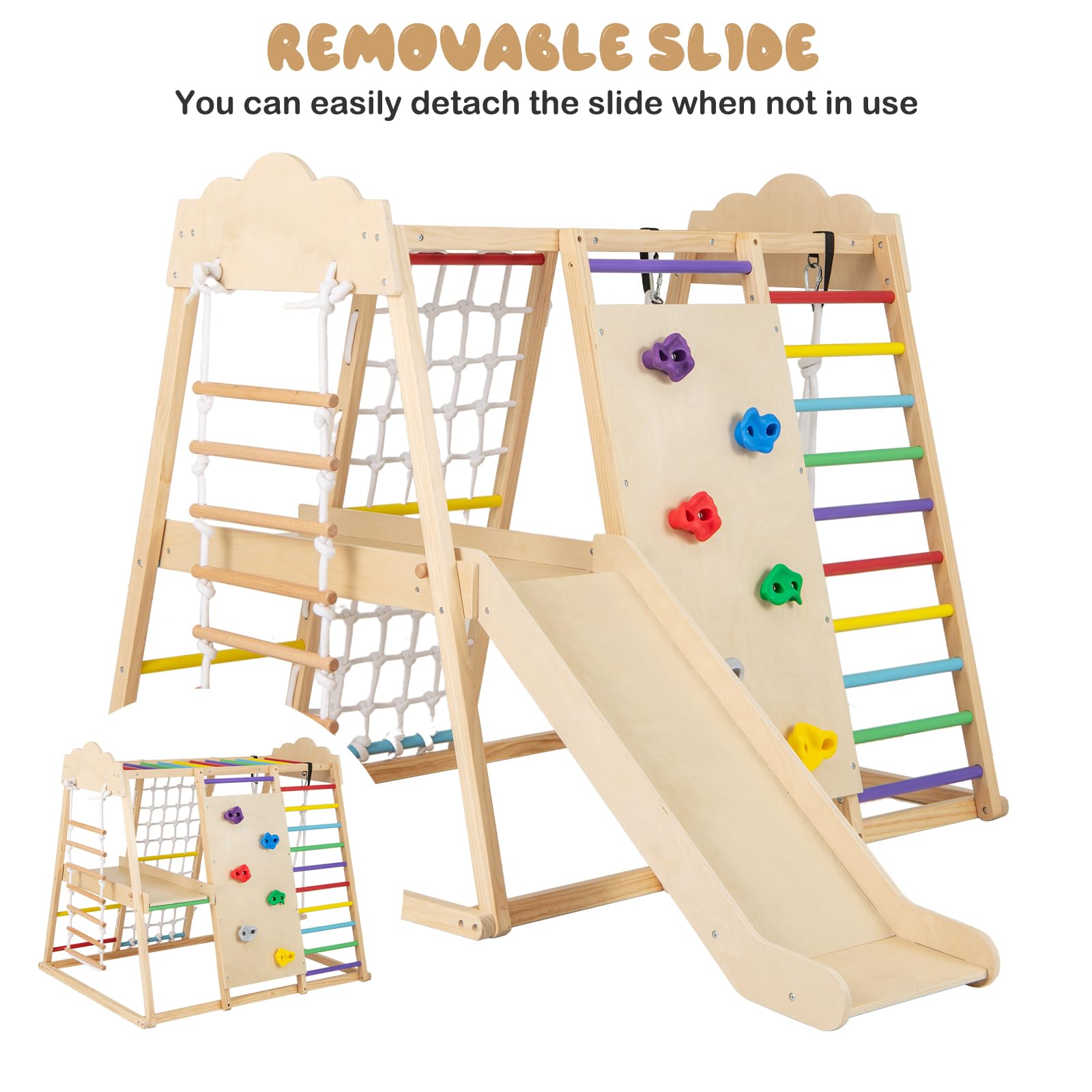 The 8-in-1 Montessori climbing playset includes monkey bars, a removable slide, a swing, a rope ladder, a climbing ladder, climbing rocks, a platform, and a climbing...