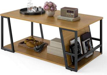 Wooden Industrial Coffee Table with Storage Shelf for Home Office