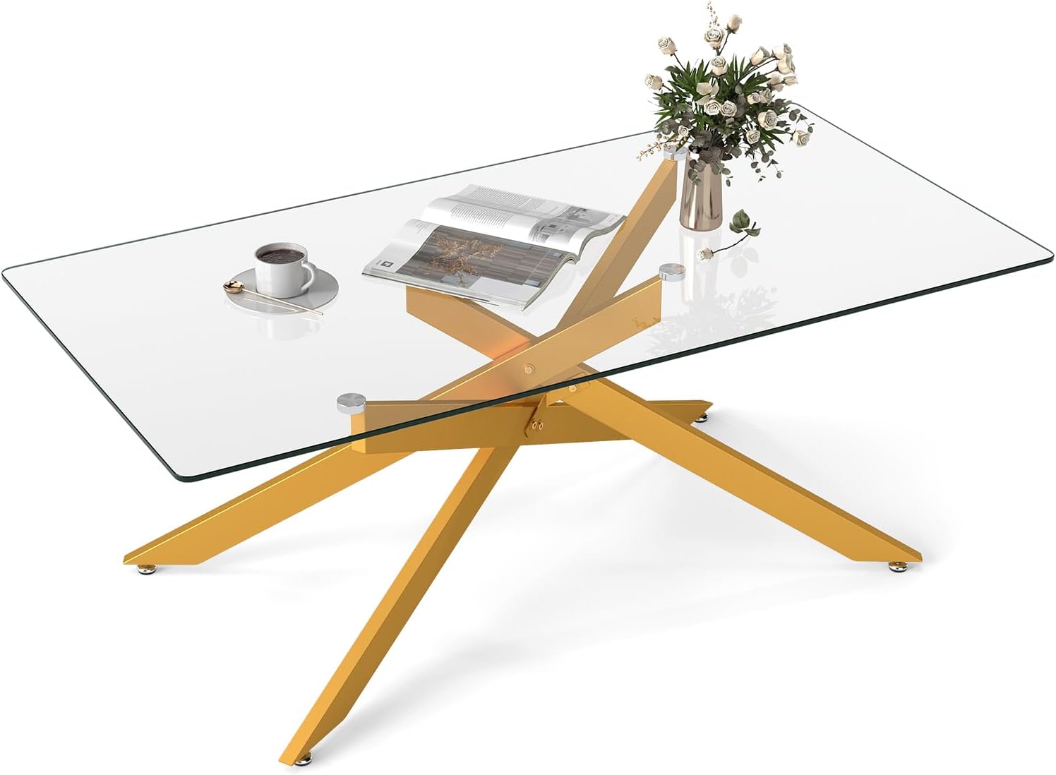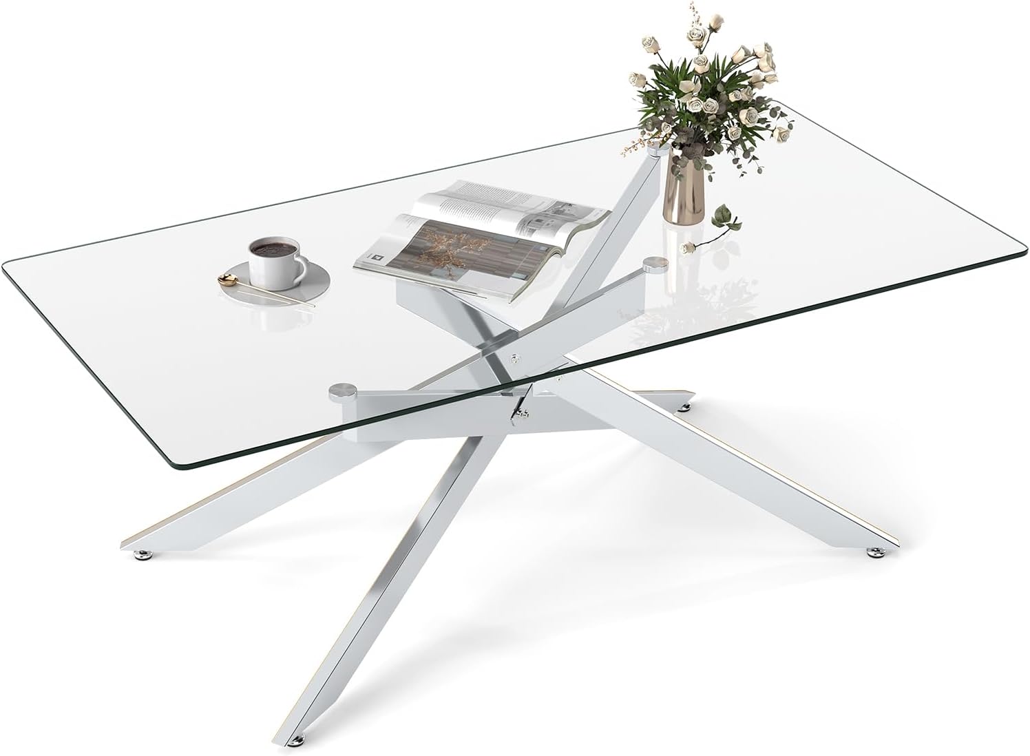 Rectangle glass coffee table with tempered glass top and metal tubular legs