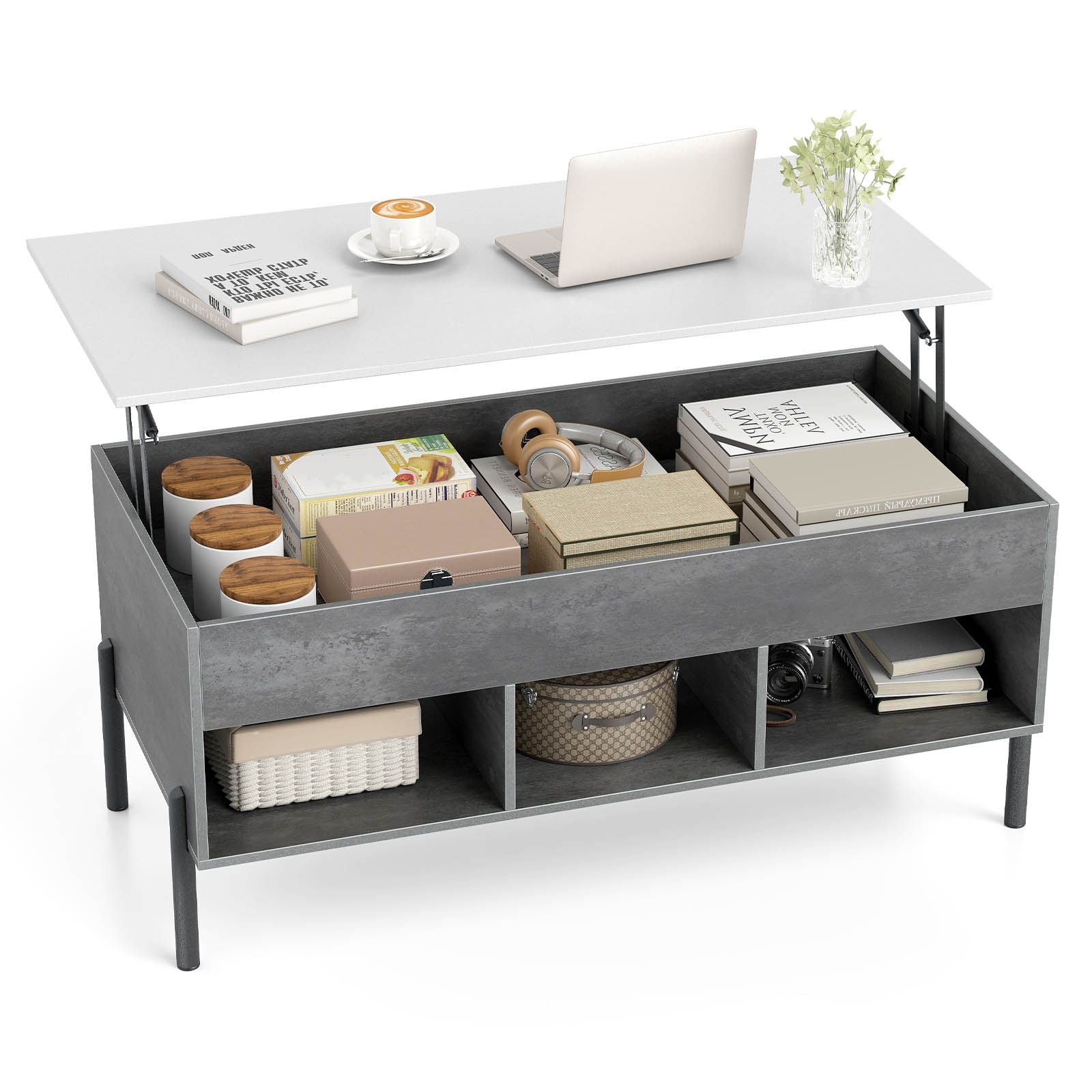 Lift top coffee table with large hidden compartment and 3 open cubbies