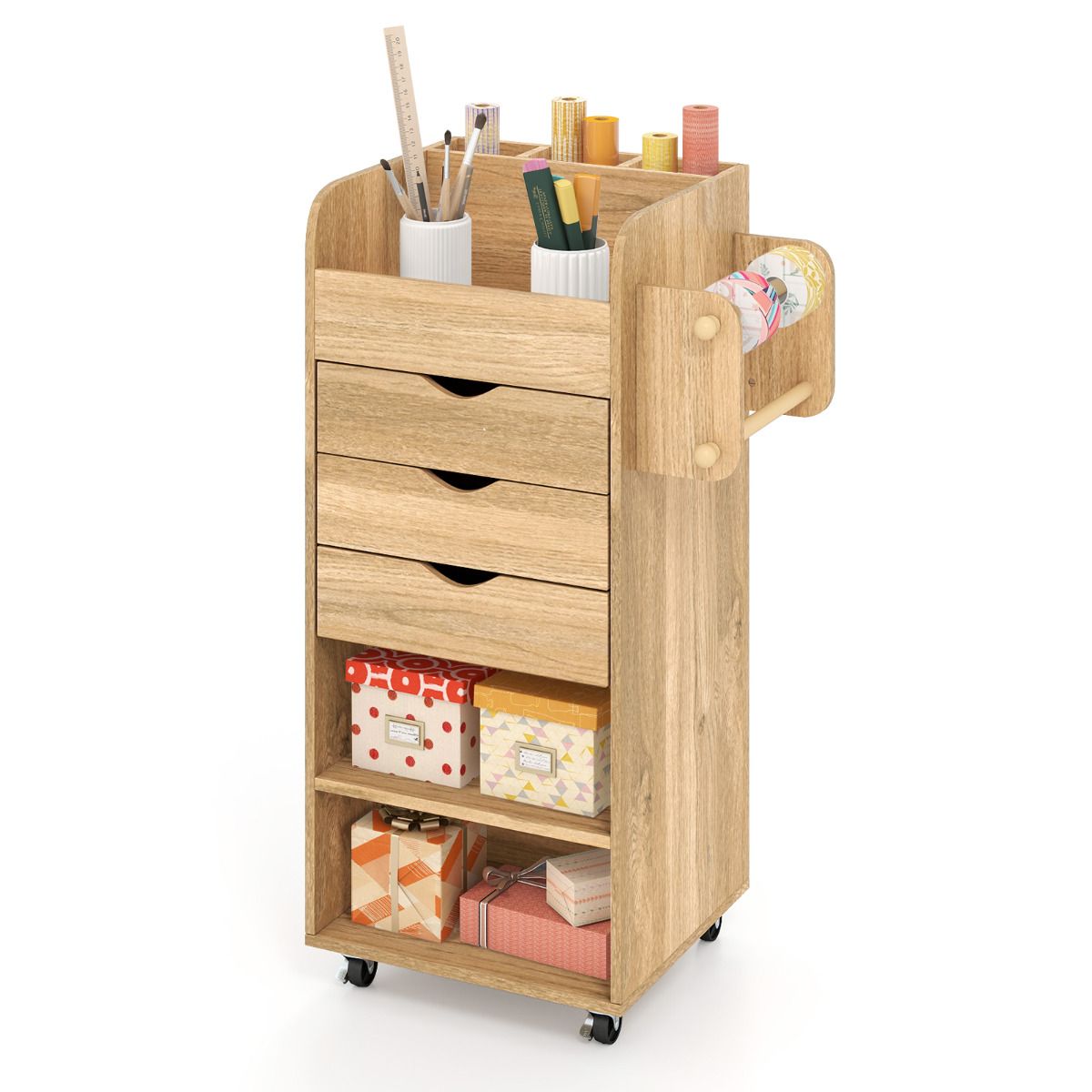 Mobile rolling storage cart with 3 drawers 2 shelves and 2 dowel rods