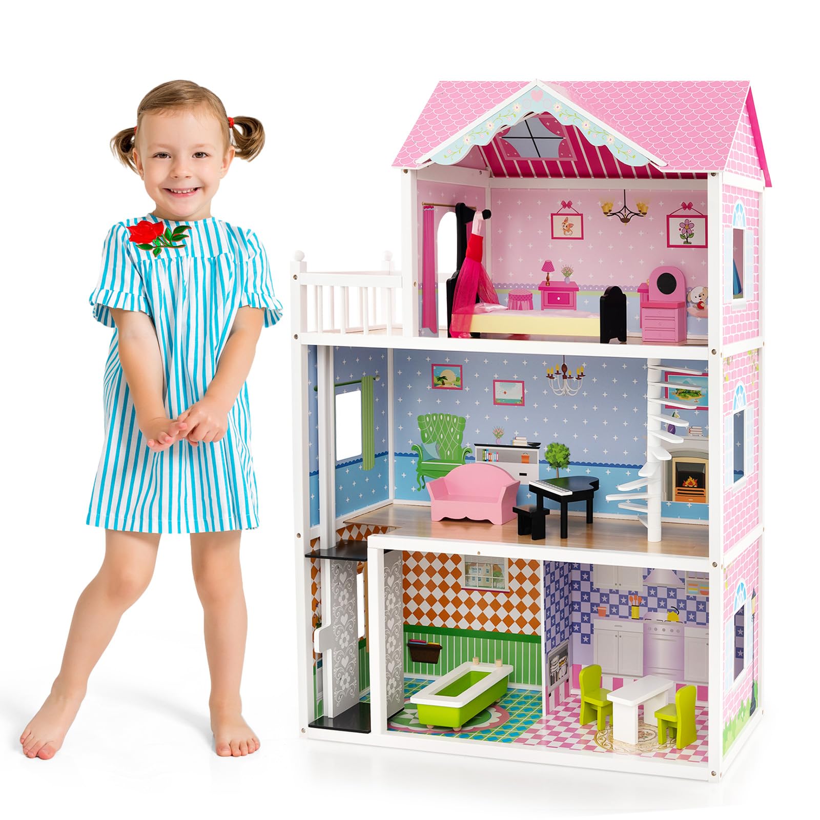 Allow kids to enjoy the fun of DIY with this wooden dollhouse! This wooden doll house features 3 stories and 5 rooms, including the living room,...