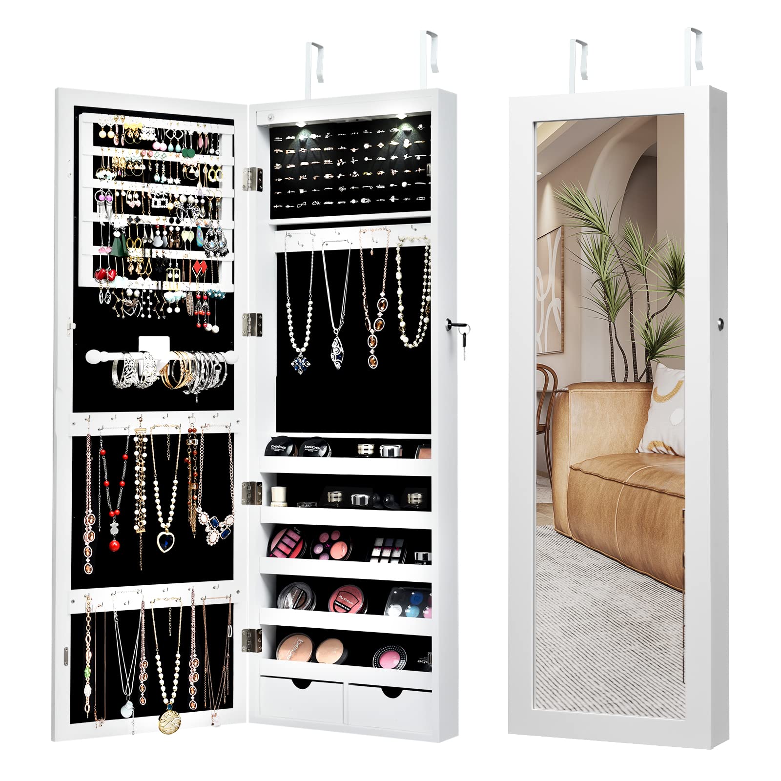 Led lights jewelry cabinet, 2-in-1 wall-mounted/door hanging makeup storage armoire with full length mirror
