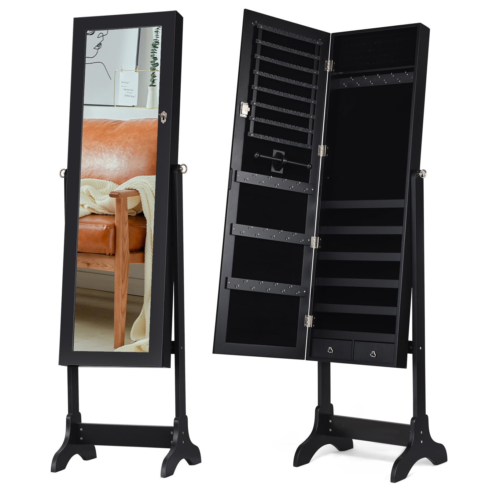 Freestanding jewelry cabinet, lockable cosmetic storage organizer with full-length mirror & 4 adjustable angles