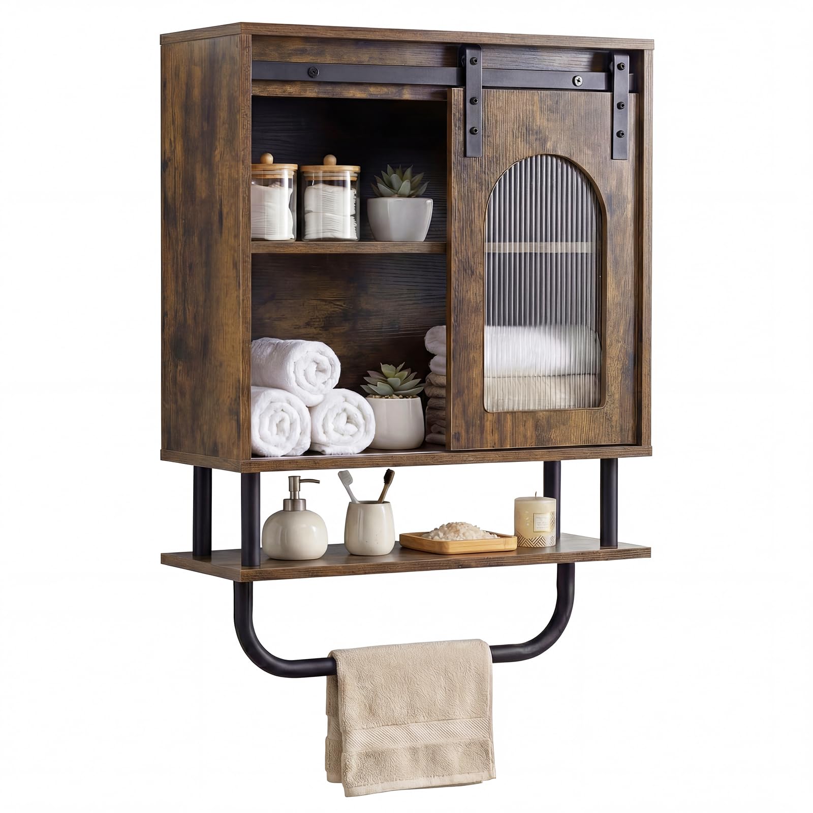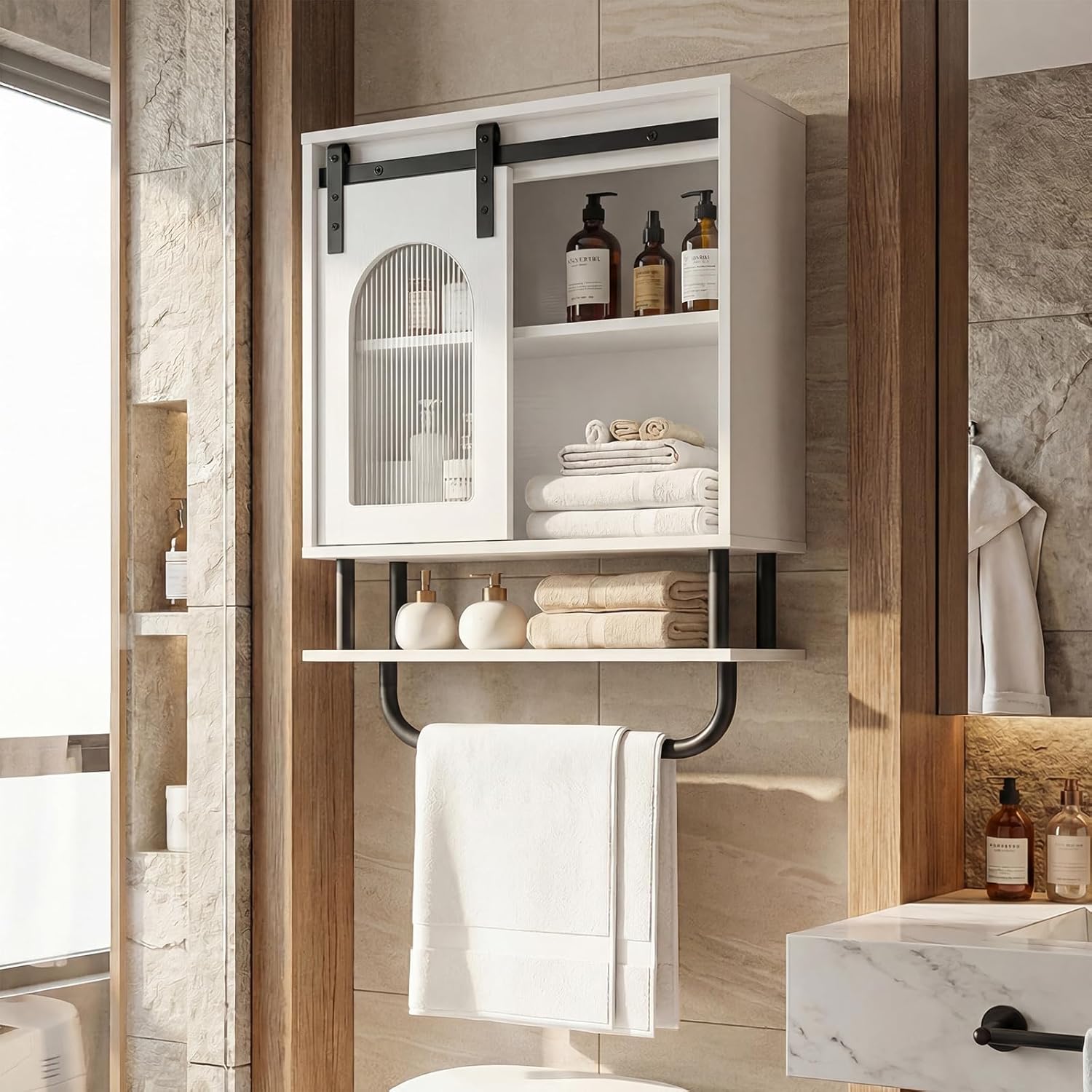 Bathroom wall cabinet, wooden over-the-toilet storage cupboard with sliding barn door