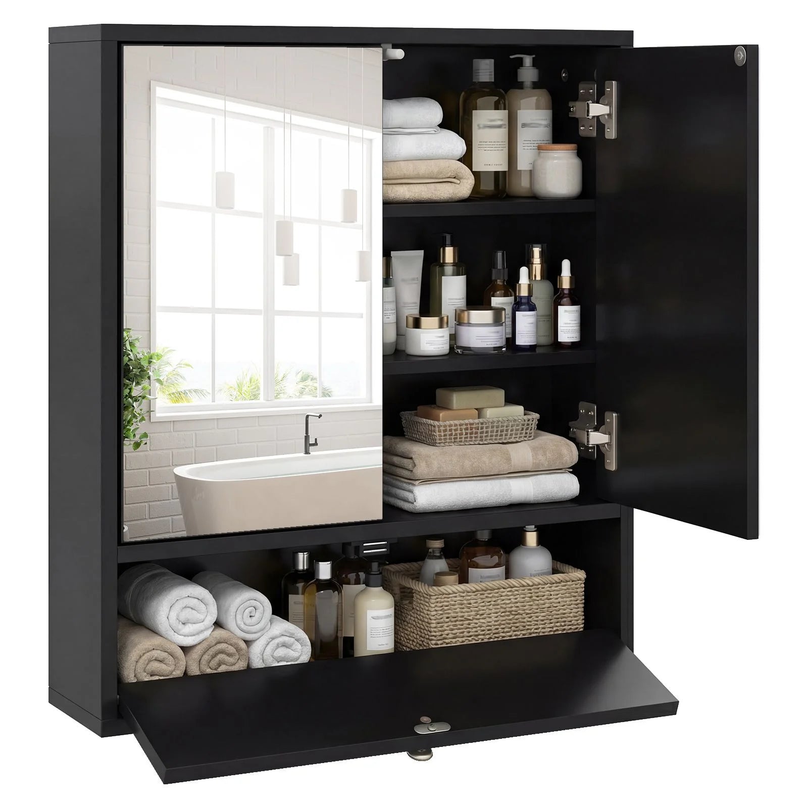 With wall-mounted design, this bathroom mirror cabinet eats up no floor area to add extra storage space to your space. Featuring open storage shelves and enclosed...