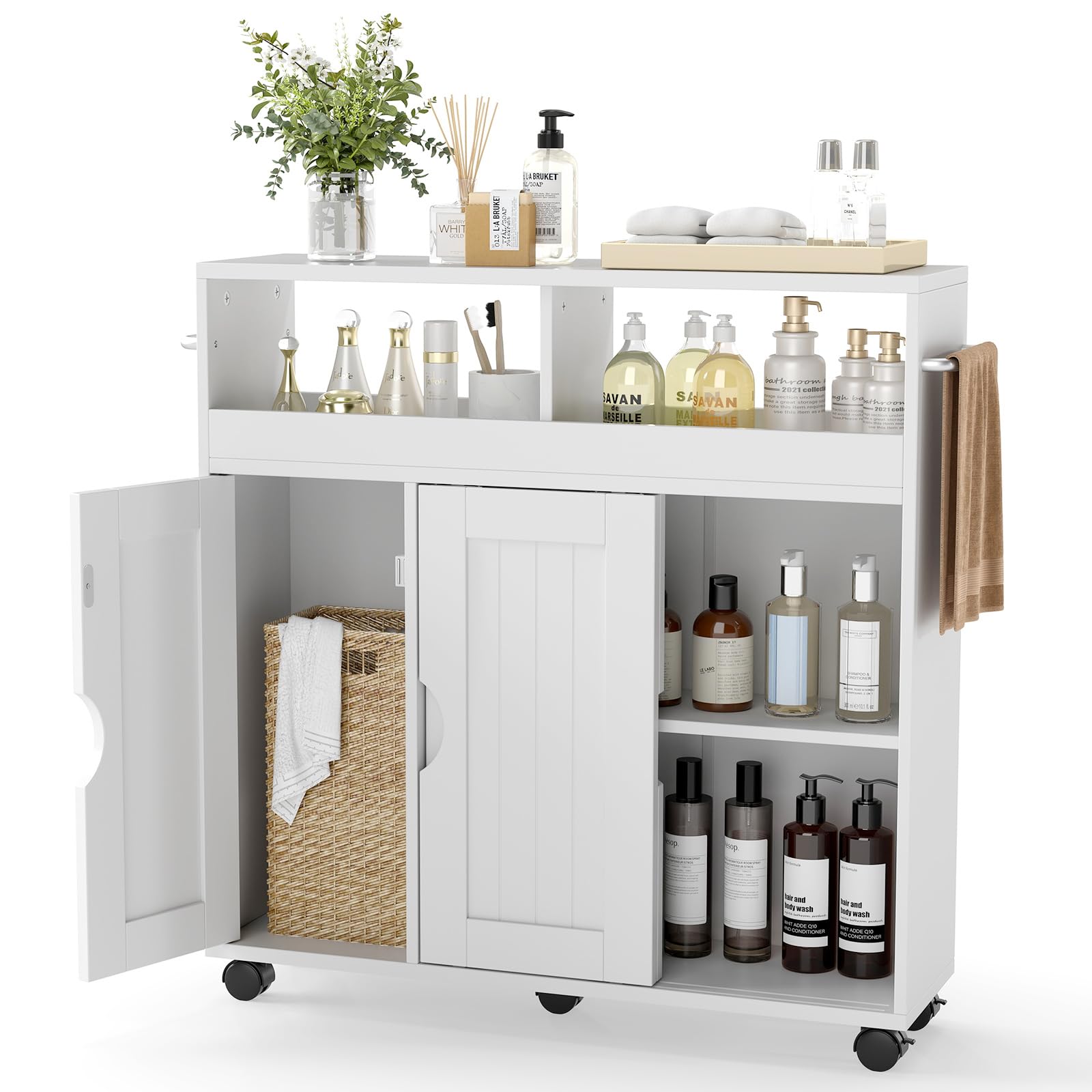 Bathroom Floor Cabinet on Wheels, Freestanding Slim Bathroom Storage Unit