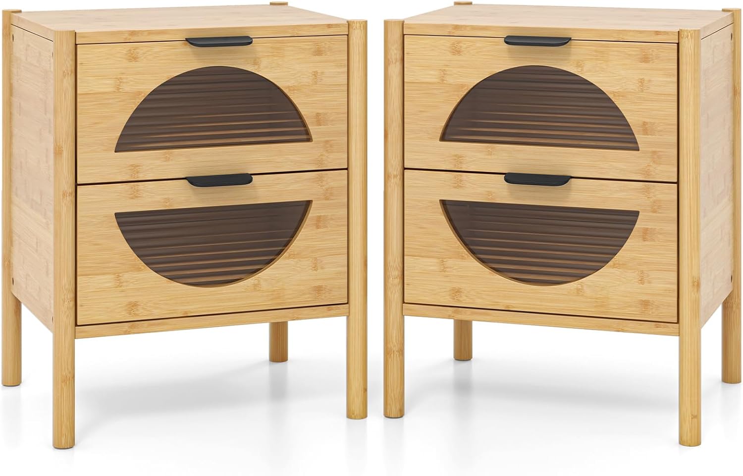 Bamboo nightstand mid-century modern bedside table with 2 storage drawers