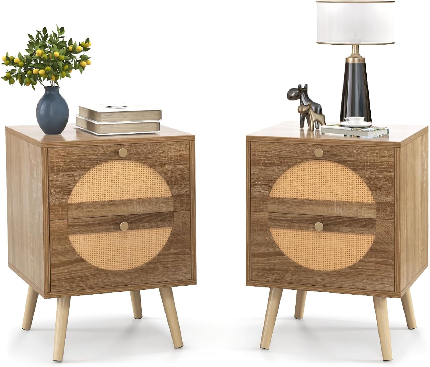 Rattan bedside table, wooden nightstand sofa side table with 2 storage drawers