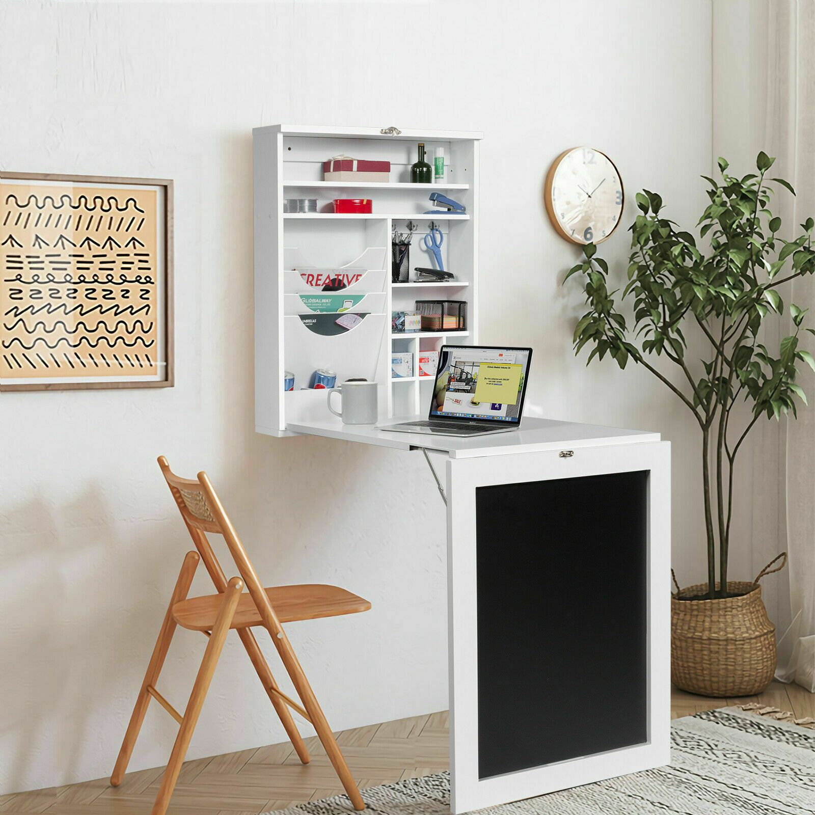 Folding wall mounted drop-leaf table, space saving floating computer desk with chalkboard and adjustable storage shelves