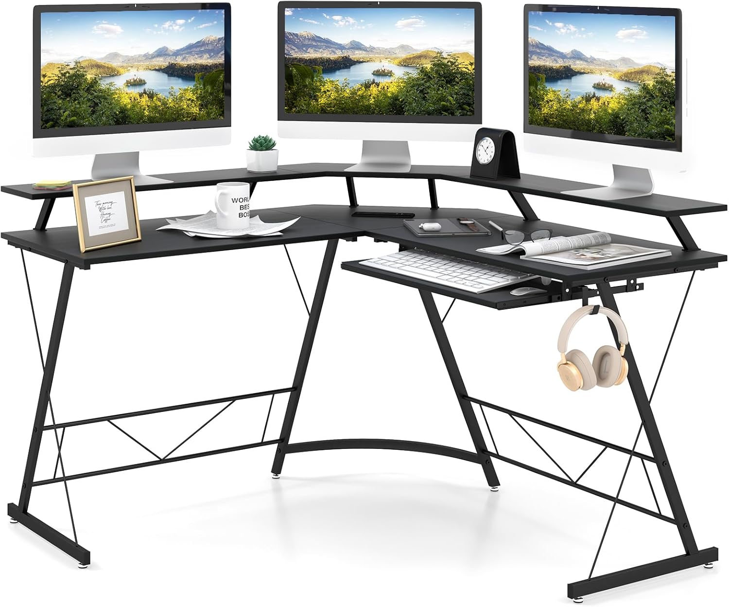 L-shaped computer desk, large office desk corner desk with power outlet, monitor shelf & keyboard tray