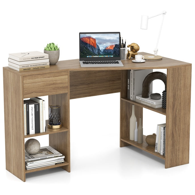 Corner computer desk, l-shaped writing study table with reversible and adjustable bookshelf