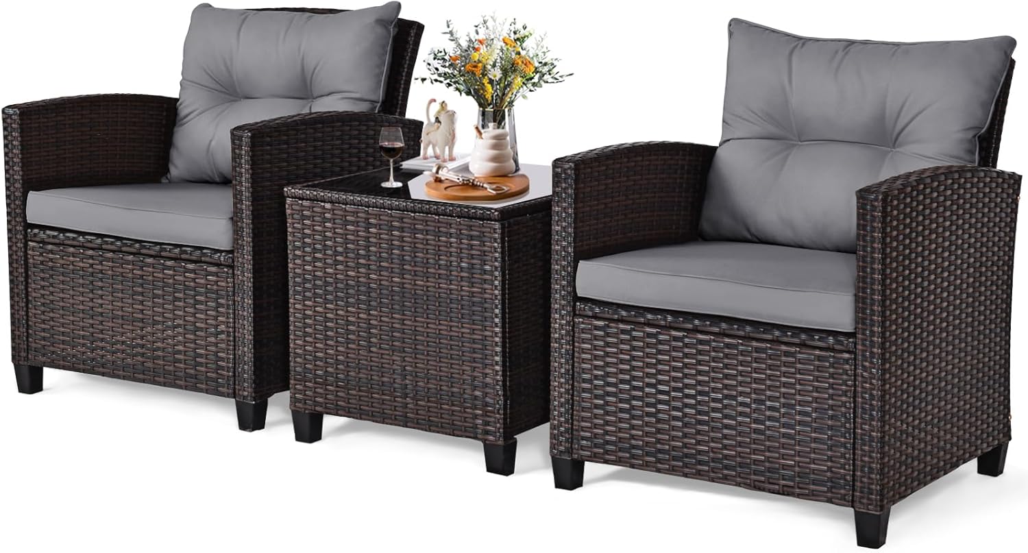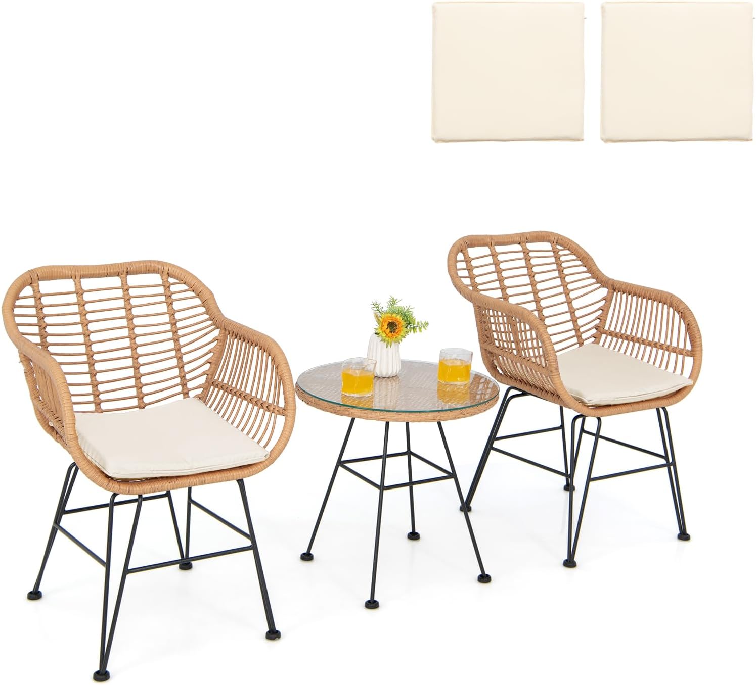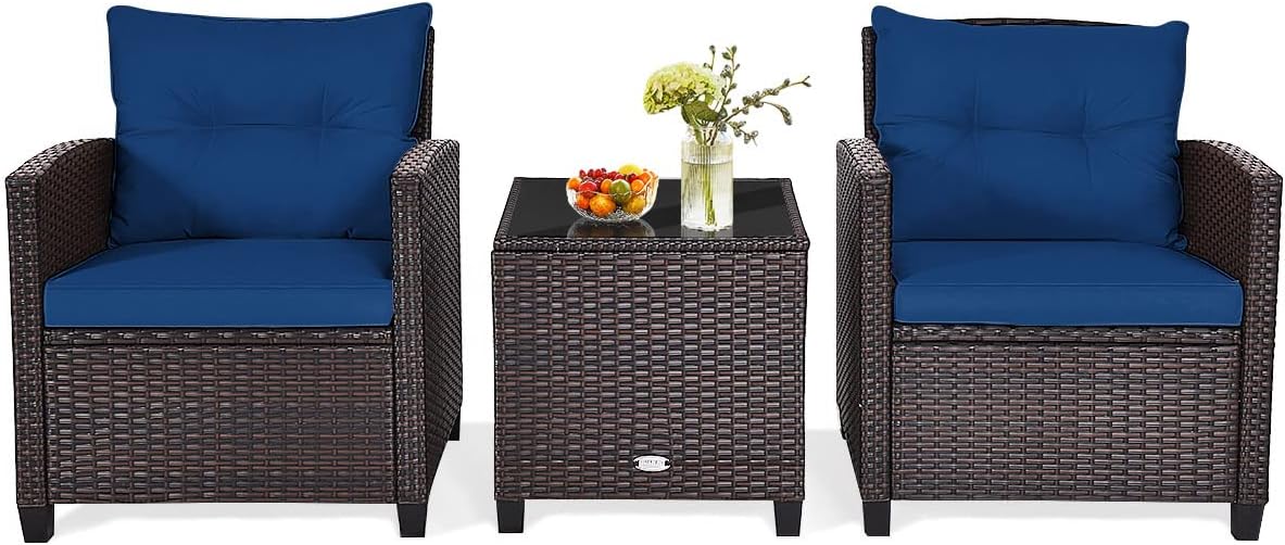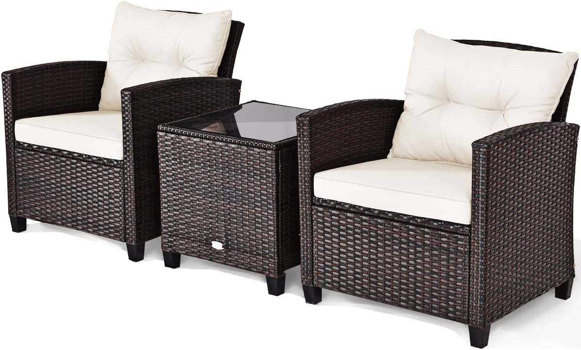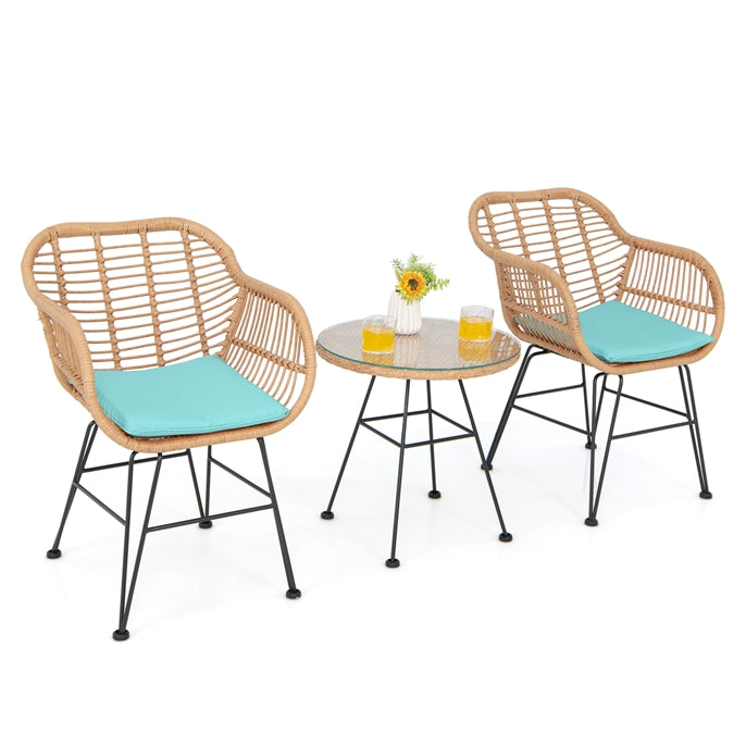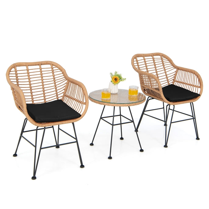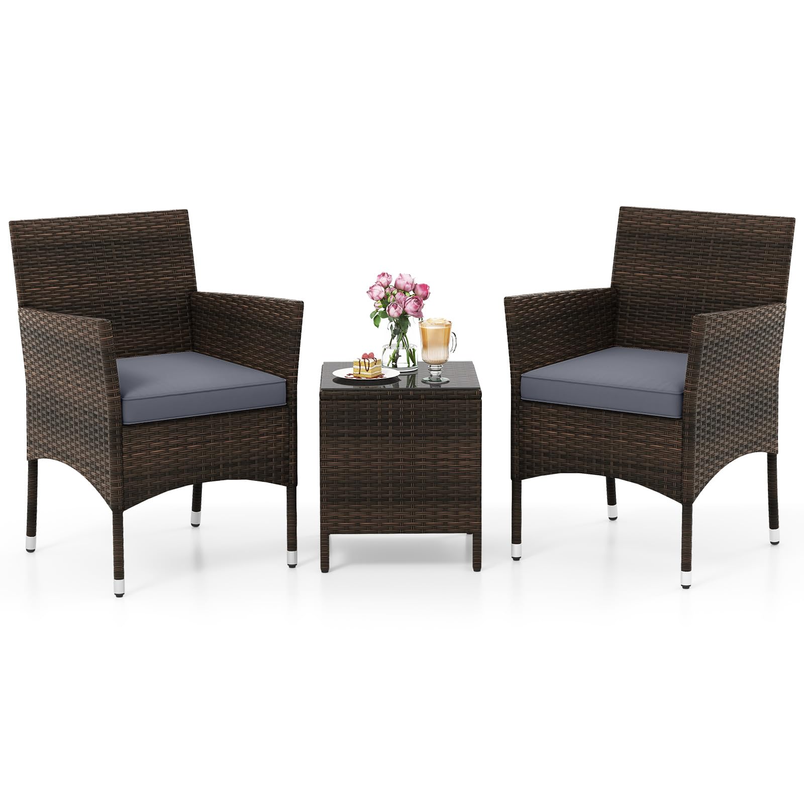 3 pieces patio rattan furniture set with soft cushions and glass top table