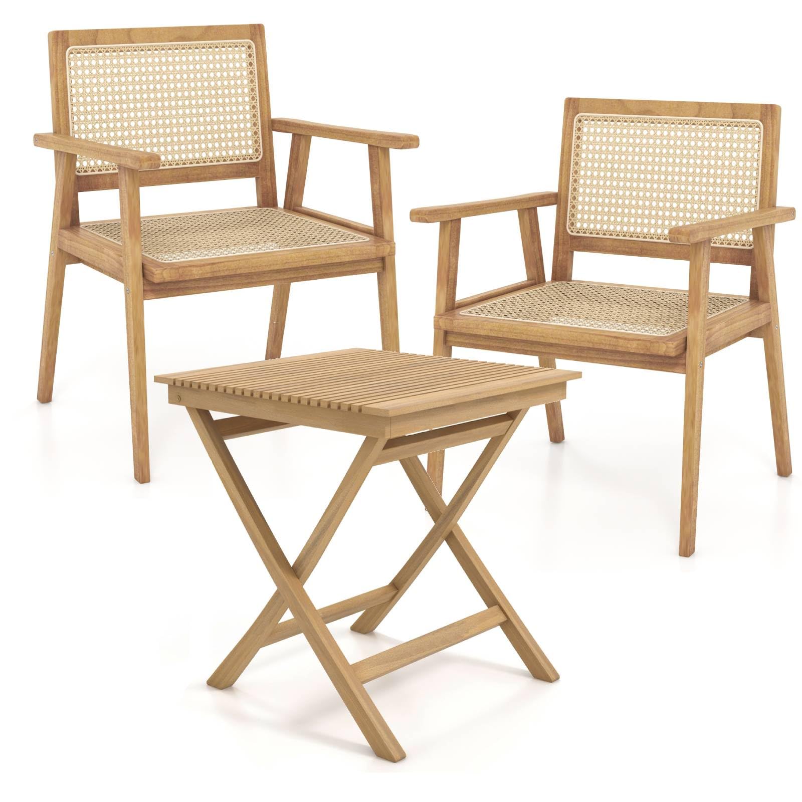 Giantexuk bistro set, folding teak wood table and chairs with rattan back, armrests & slatted tabletop