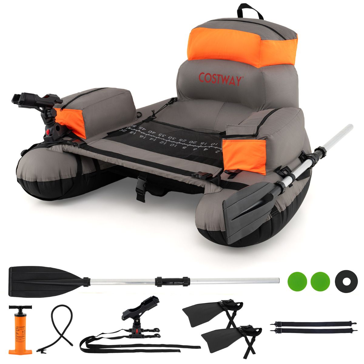 Fishing boat with pump, adjustable straps, paddle, pockets, fish ruler, rod holder