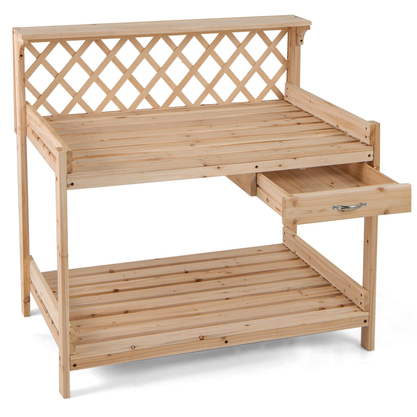 Garden potting bench table with lattice trellis and removable drawer