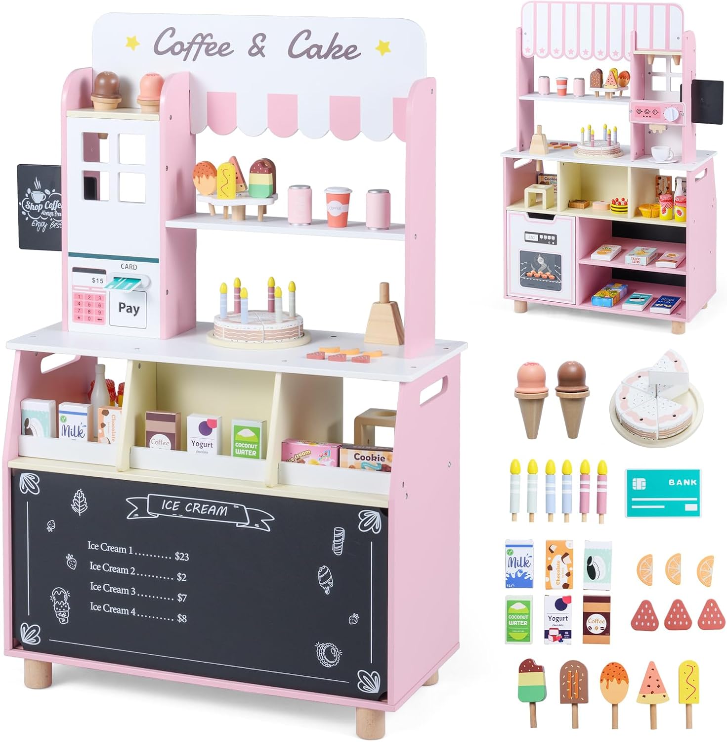 Kids Ice Cream Shop, Wooden Grocery Store Playset with 27 Accessories