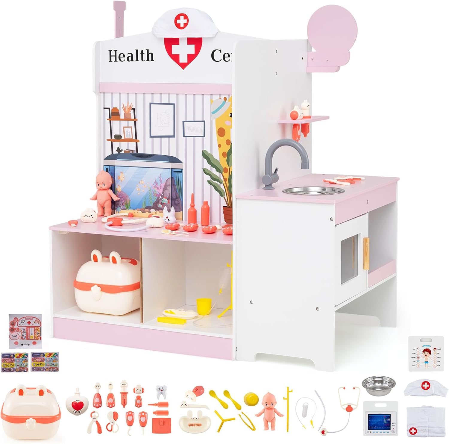 Wooden Toy Medical Center Playset with Faucet and ECG Monitor for Aged 3-6