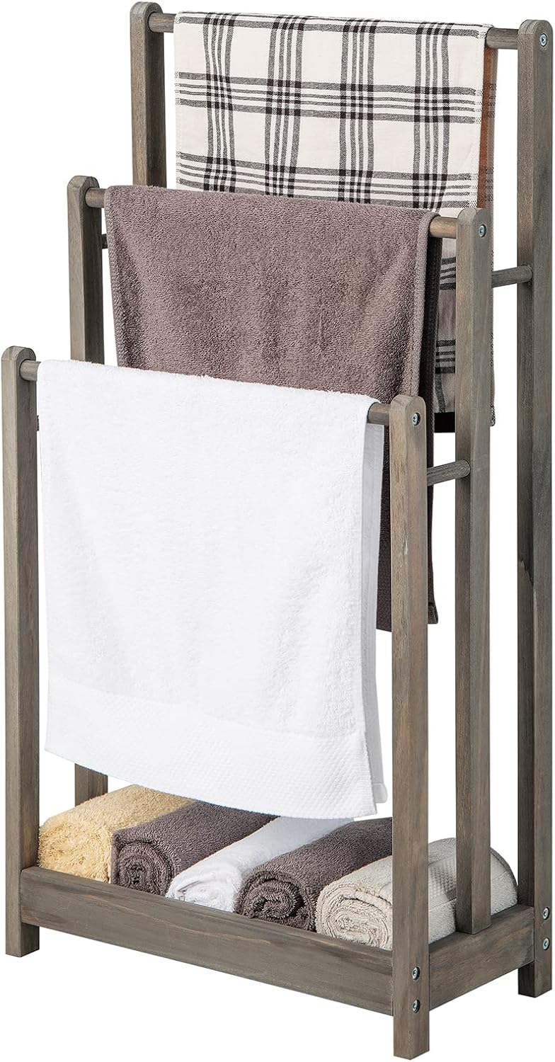 Solid wood towel holder drying stand with 3 towel rails and storage shelf