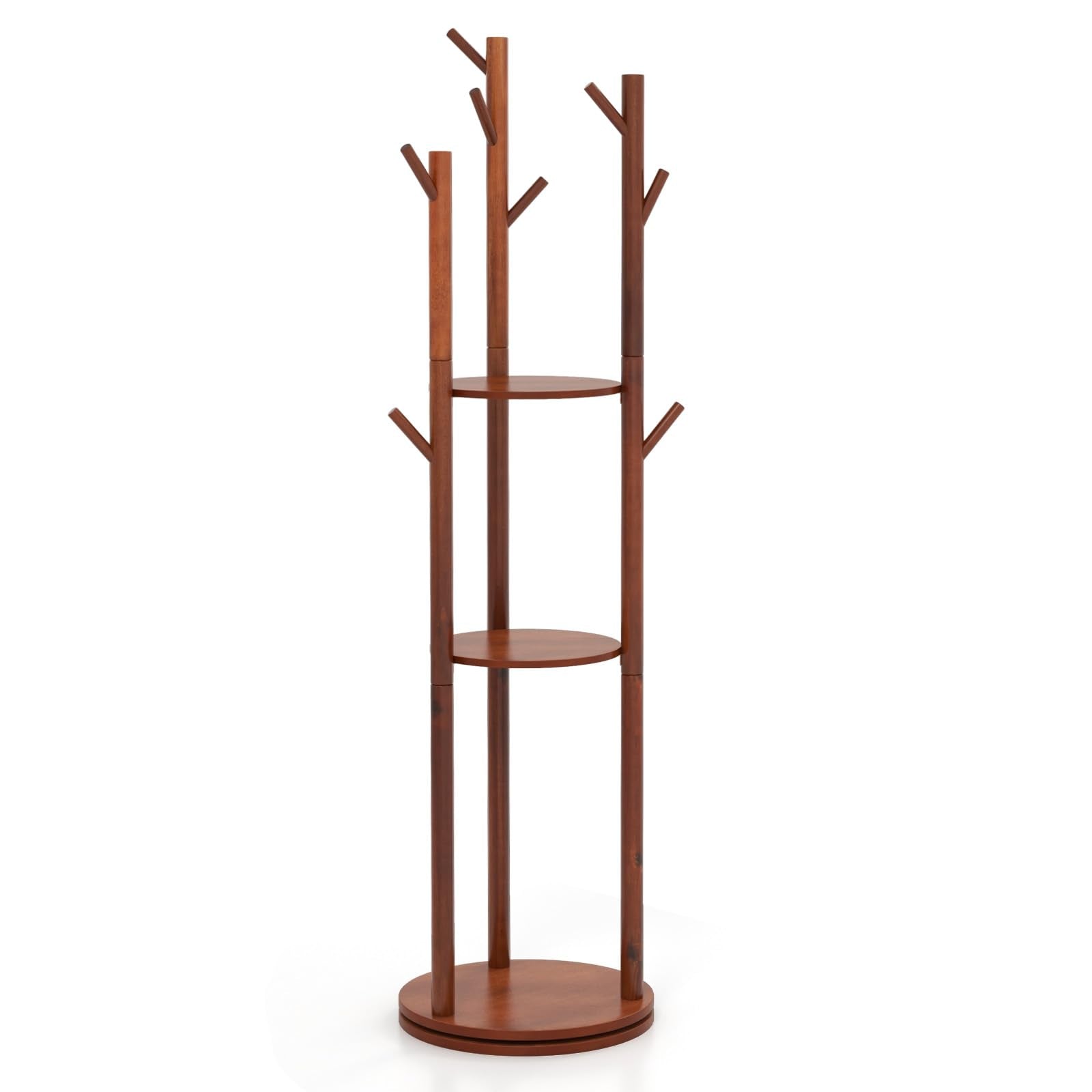 Freestanding Wooden Coat Rack Stand with 3 Display Storage Shelves and 9 Hooks