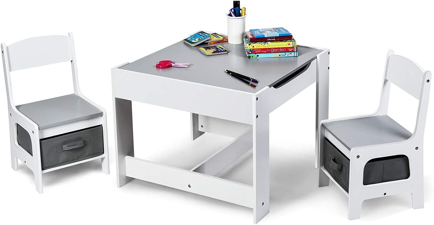 Kids table and chairs set, wooden toddler activity table set with double-sided tabletop and hidden storage