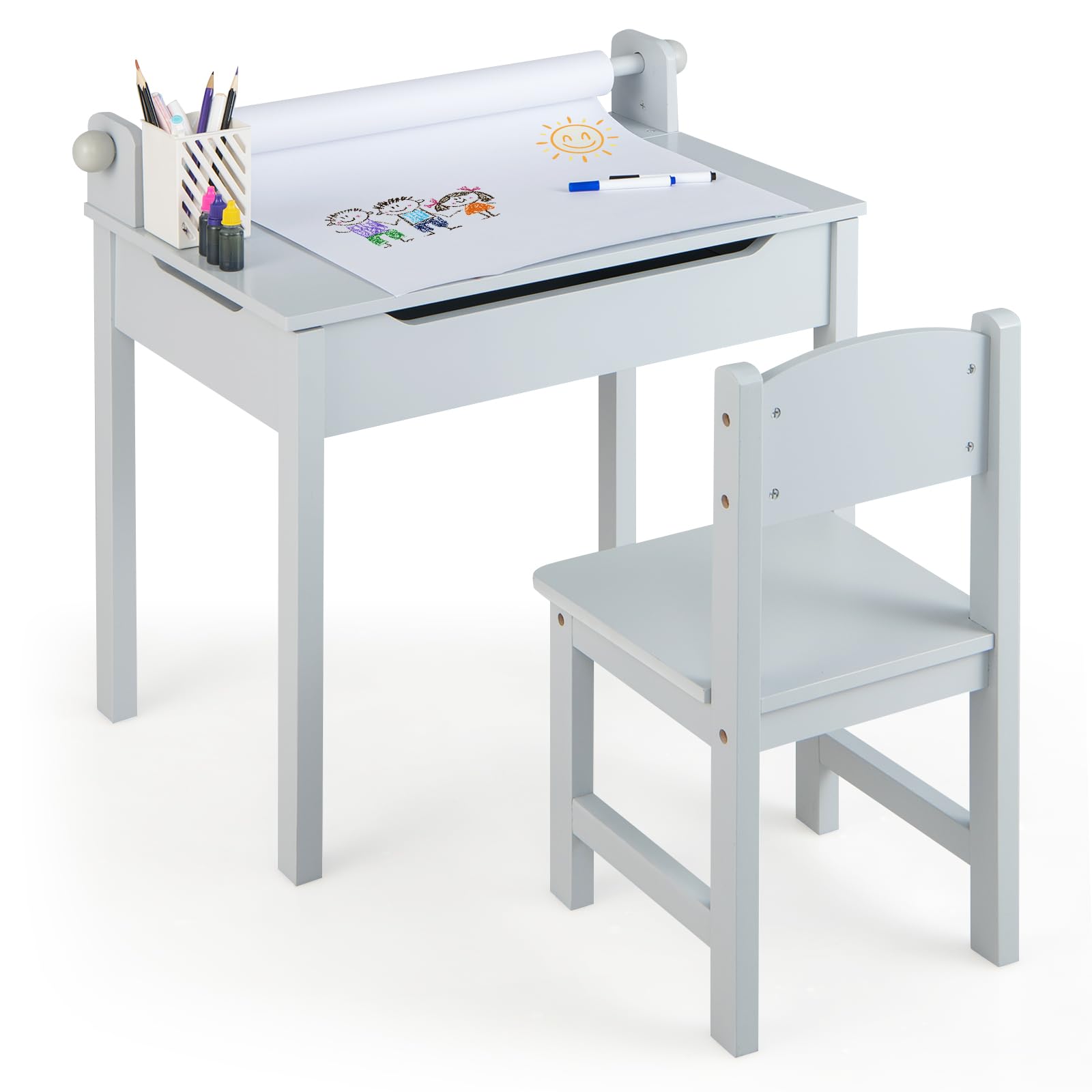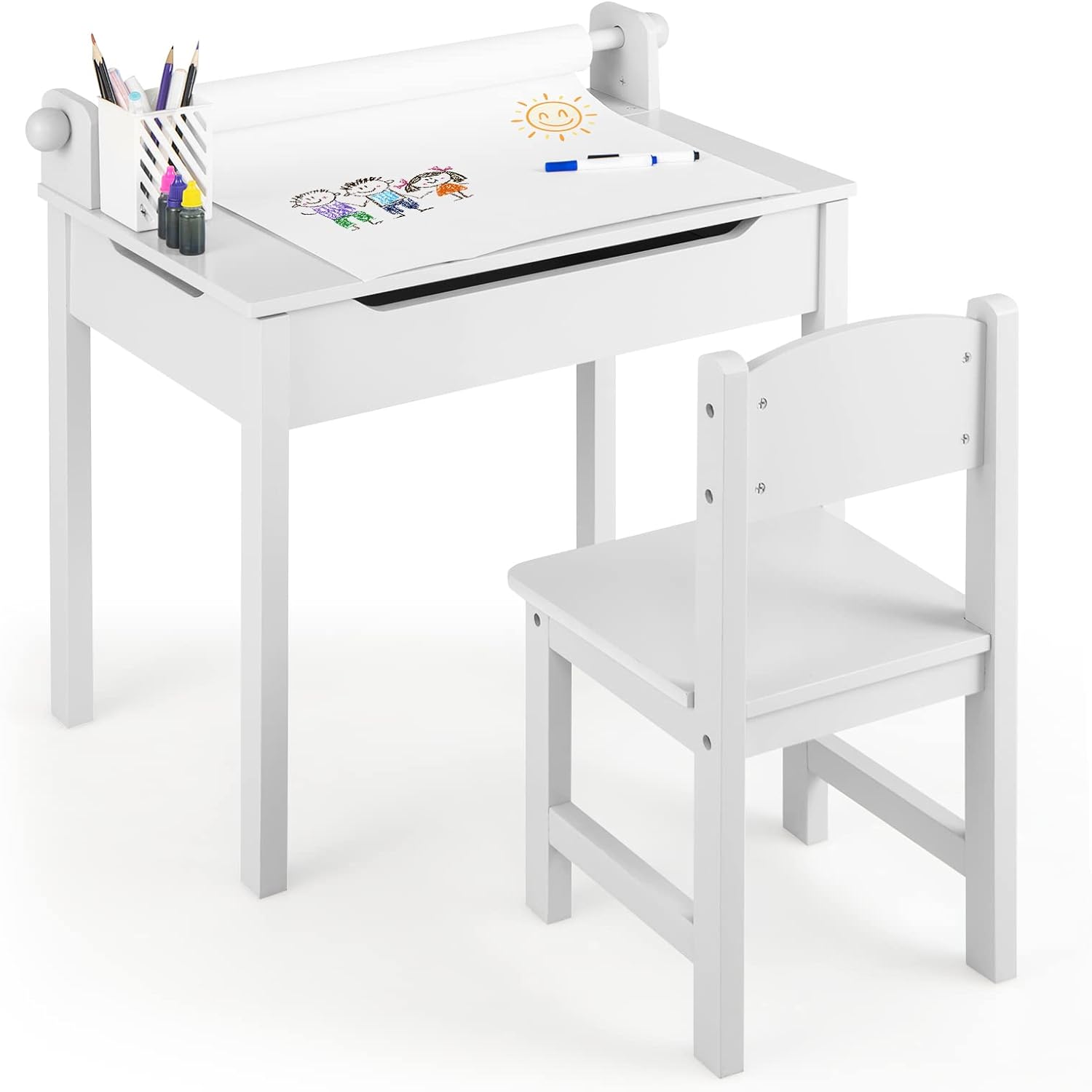 Kids table and chair set, flip top toddler art craft desk with paper roll, children activity furniture set for nursery playroom