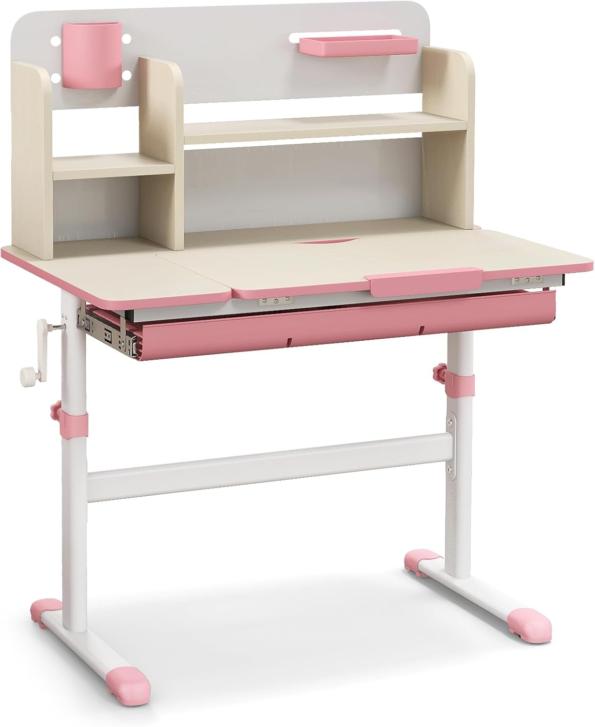 Kids study desk, height adjustable children school desk with storage, tilt desktop, pen holder & scale ruler