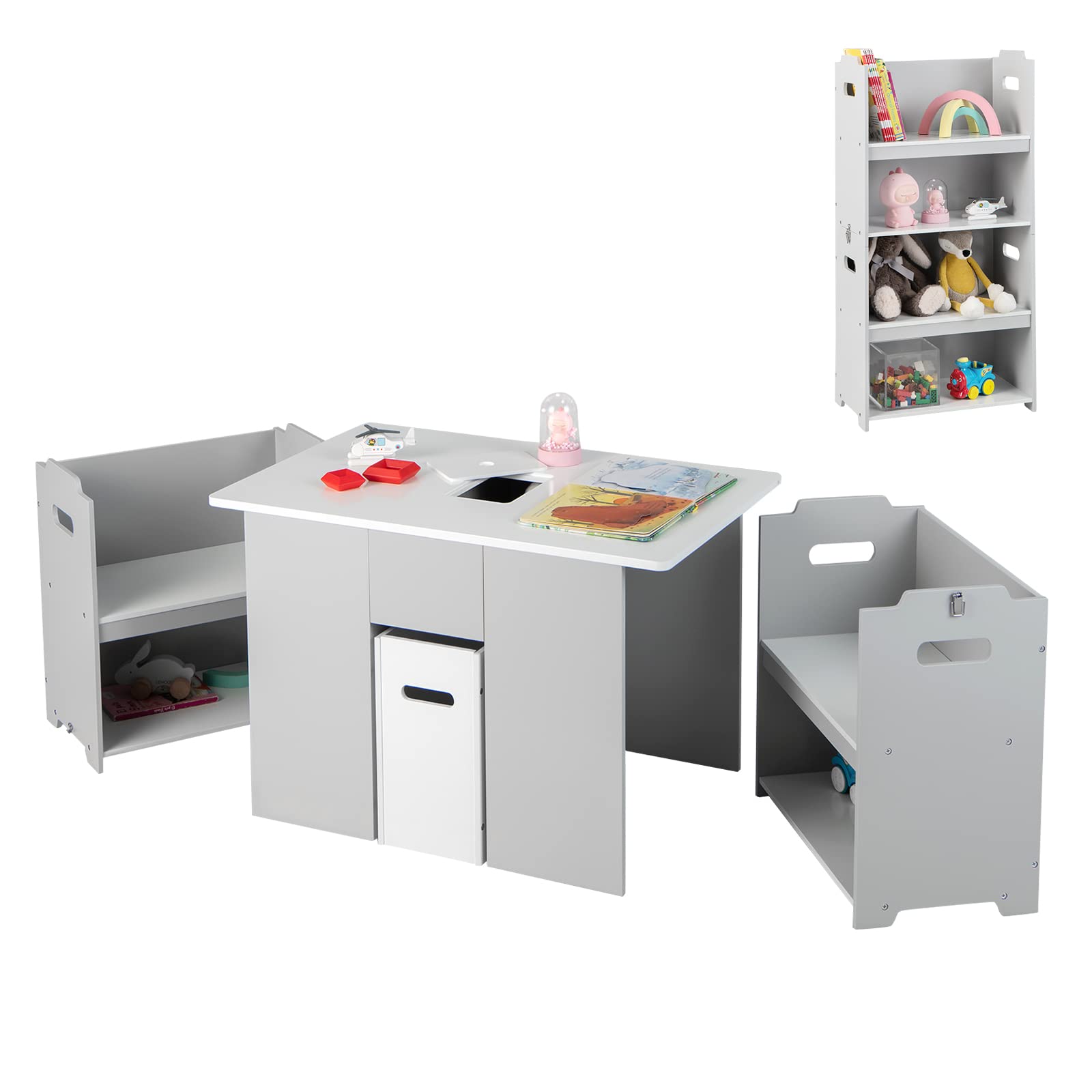 Kids table and chair set, convertible toy storage bench with 2 removable fabric bins