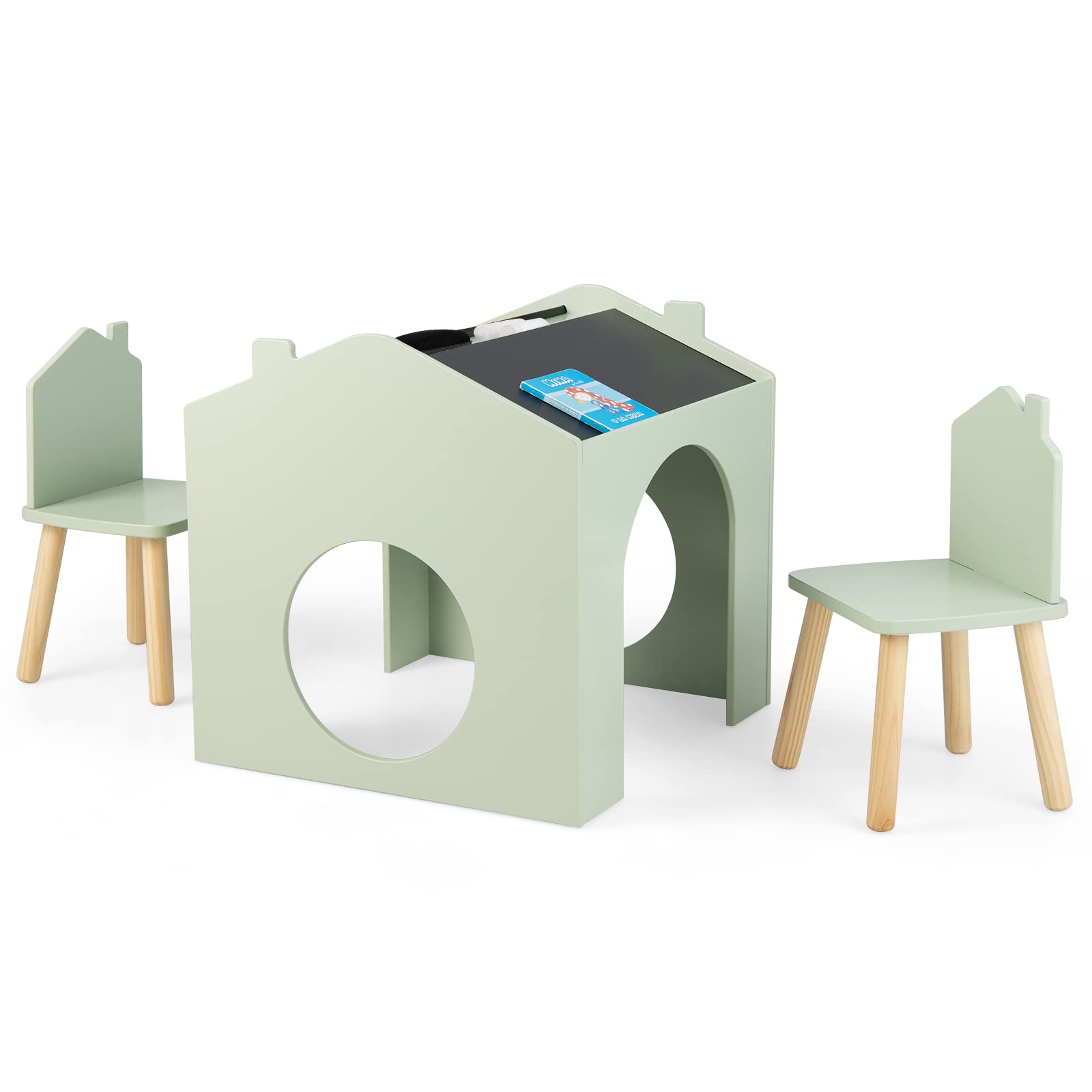 Kids table and chair set, wooden children desk with chalkboards, 3 pieces toddler activity furniture for learning, drawing, dining