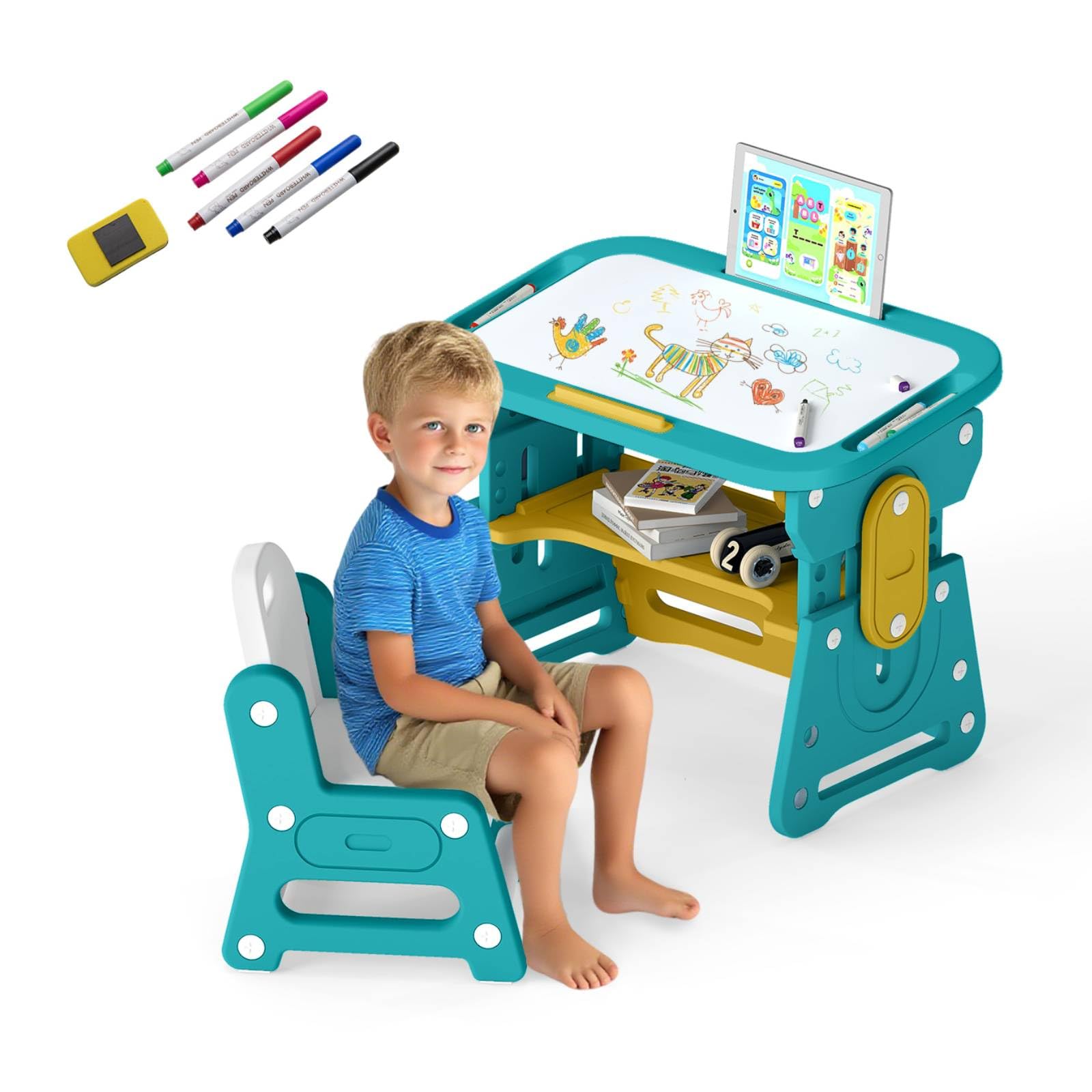 Kids table and chair set, 2-in-1 wooden desk chair set & storage organizer with blackboard