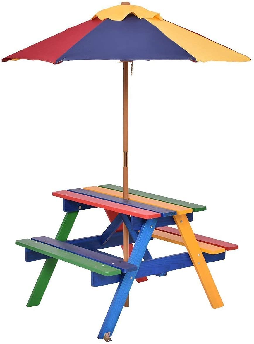 Kids picnic table and chair set with 2 folding chairs and height adjustable umbrella
